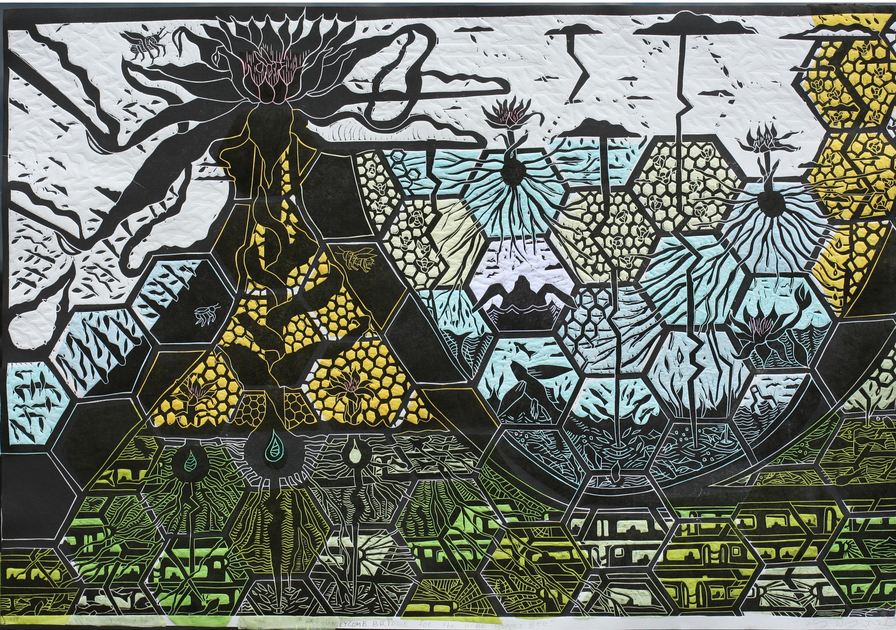 My work tries to contain the natural world on paper. Paper, is the connector, that makes all of my prints color and light. I imagine the worst part of not being alive is, not touching, smelling and seeing material in all its tactile beauty that nature evokes. My art work tries to draw a human connection with our world and slowing down of time. We are whole when we are connected to the soil and earth.