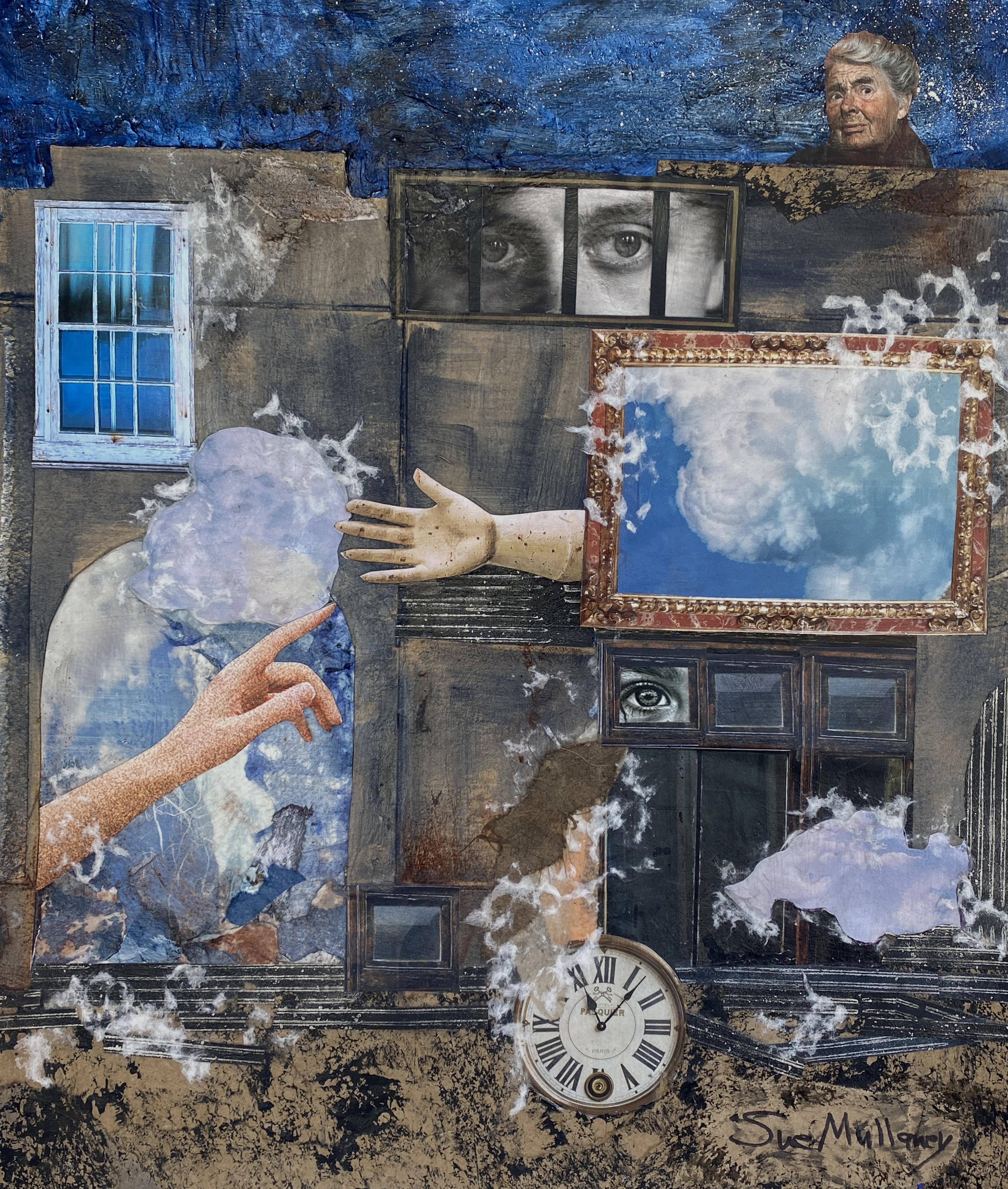The art of collage involves the metamorphosis that occurs when bits of paper, photographs, old letters, magazine images, ephemera, etc., are repurposed to create new realities. I like to start with a loosely defined idea and see how it evolves. The juxtaposition and layering of different images and textures start to create a story.