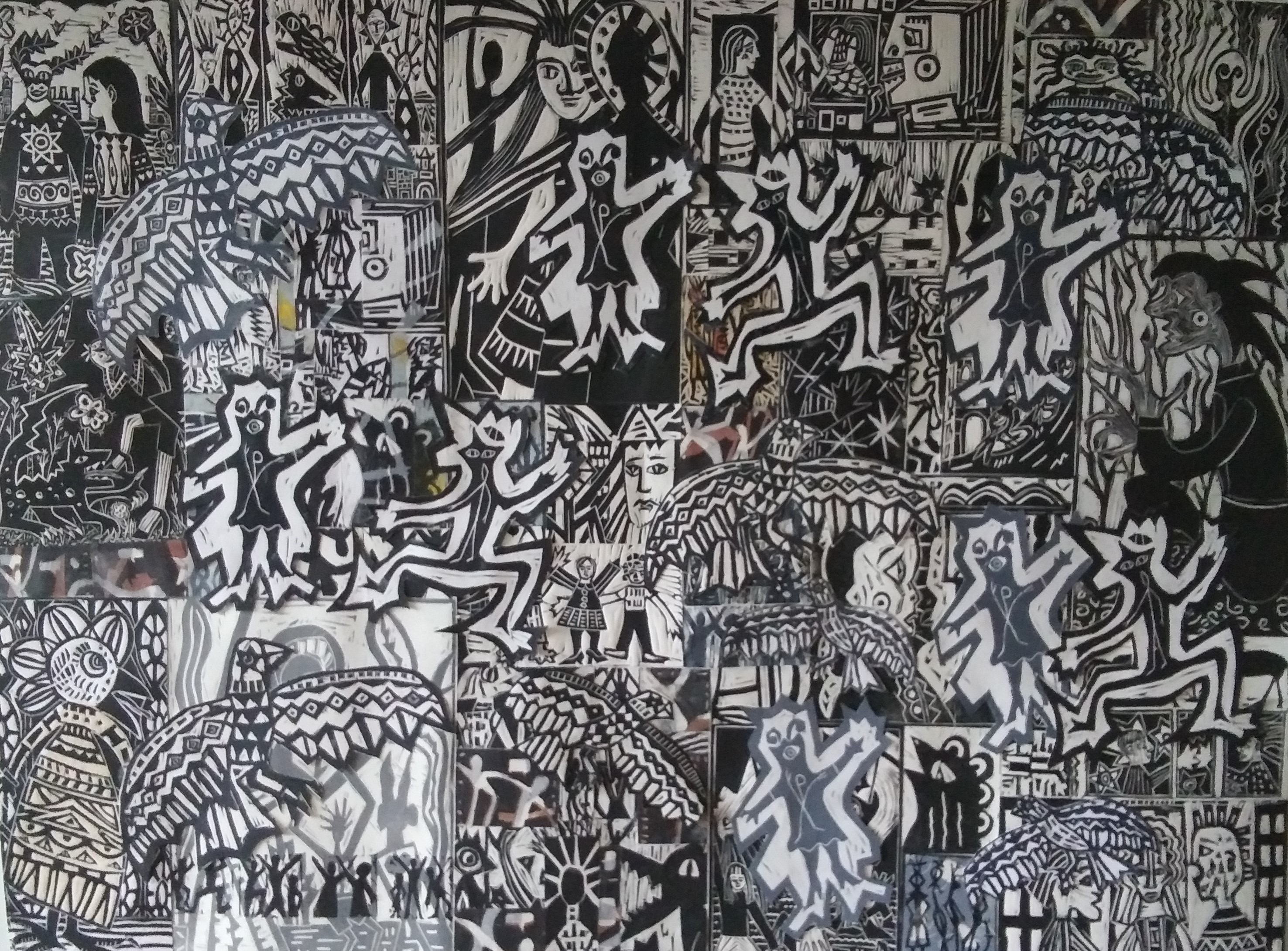 I started creating linocut collages as a way to make larger work when I no longer had access to a large etching press. But I soon began to see that working this way, allowed me to continue my interest in visual narratives. My linocut collages tell personal stories created with images designed to both reveal and conceal. Our modern visual field is filled with multiple images that we are asked to make sense of simultaneously. These are repeated in many formats such as comics, graphic novels, advertising and film. Printmaking allows for repetition of images that may be put together in many ways. The works may be shown individually or attached together to create wall sized pieces. The narrative may not be the same for the viewer as it is for me. My work juxtaposes a primitive, perhaps story with a modern format.