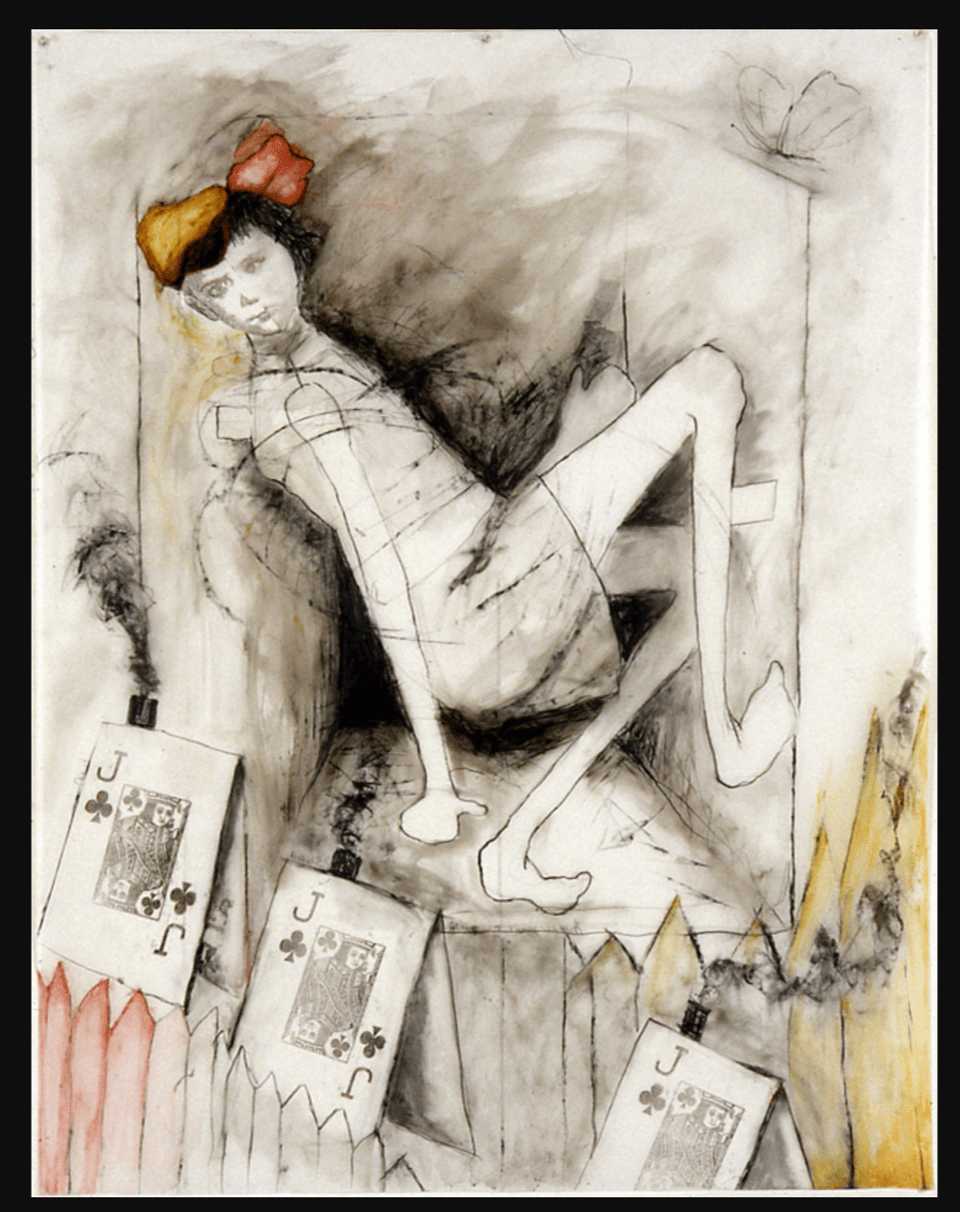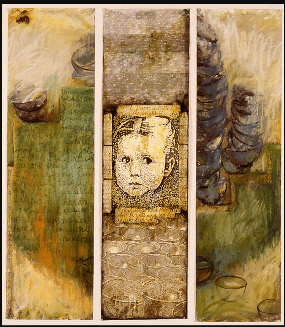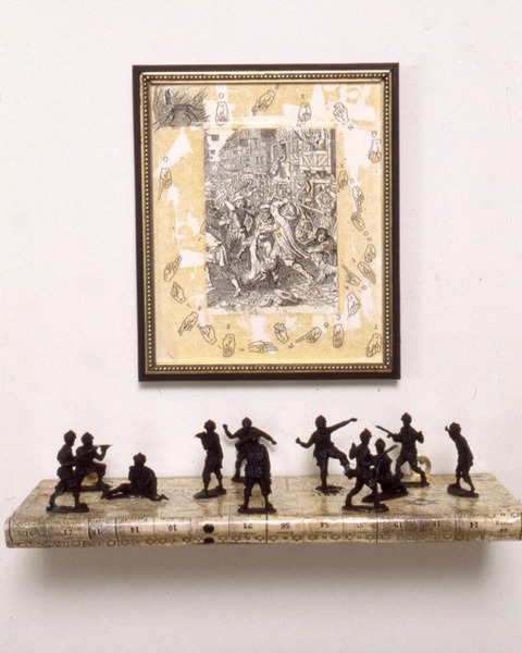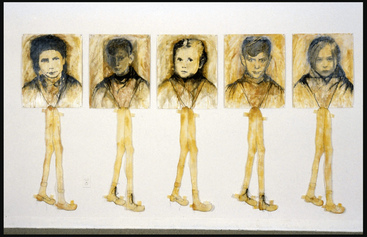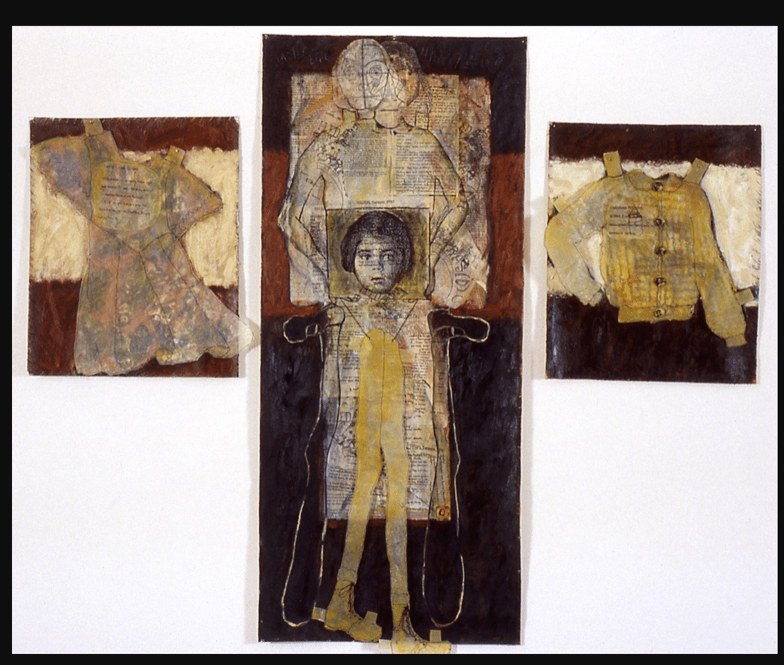 In an earlier review of my work , Patricia Rosoff noted ”Caldwell’s elaborate composite images have a whimsical quality. Her figures are like dolls, angular and attenuated. The ghostly children stretch out flat, silhouetted and frontal like drawings of children. They are pieced together and other elements – some of which even have little square tabs like paper doll clothes overlaid. Numbers thread across the field of reference behind string-bean skinny girls who jump rope. But this is no childhood fantasy .Caldwell’s subject is the Holocaust——“