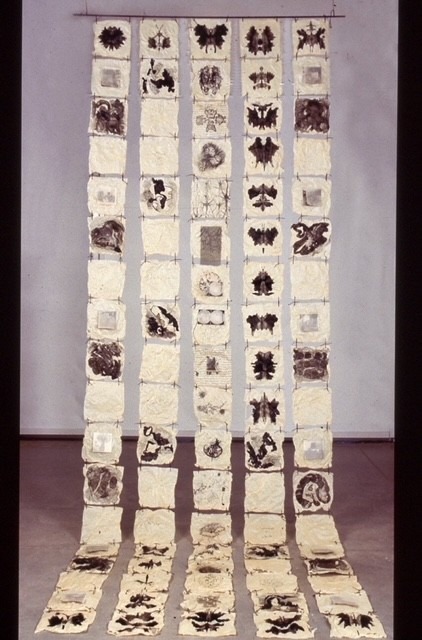 In the final paragraph of her essay Patricia Rosoff wrote; . “Like a medieval sculptor, Caldwell’s strategy is to give physical form to demons in order to contain them. Interestingly, however, increasingly she does this as a housewife might – drawing on domestic, rather than formal artistic tradition. Elements are basted together, woven, sometimes, and mentally sifted-ingredients for a felt rather than cerebral response. Caldwell’s involvement is first of all personal and secondly subjective – a matter of emphatic projection and physical exploration. For all its intelligence, this work will not play out in straightforward, linear fashion. And this is precisely the inherent power not only of her method, but also of her forms”