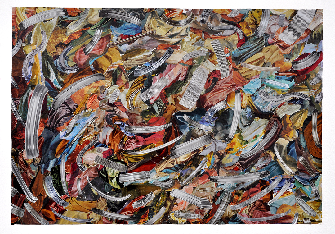 At first, I pasted down images of objects and faces.Then I felt the need to express more immediacy and action in my work. I became drawn to the Abstract Expressionists, such as Jackson Pollock and John Chamberlain. I began to tear up the images, and discovered that each bit of paper contained its own light and dark as if it was a brushstroke of wet paint. In effect, I was turning a solid bit of paper into a liquid stroke.