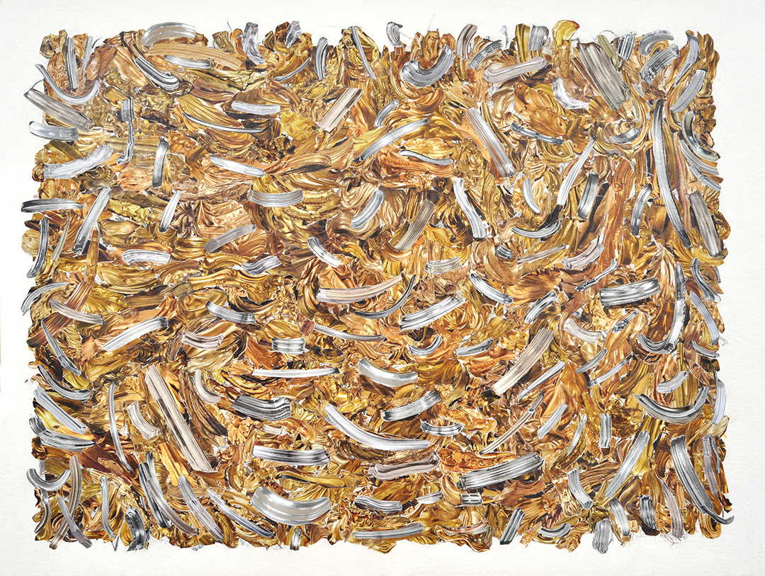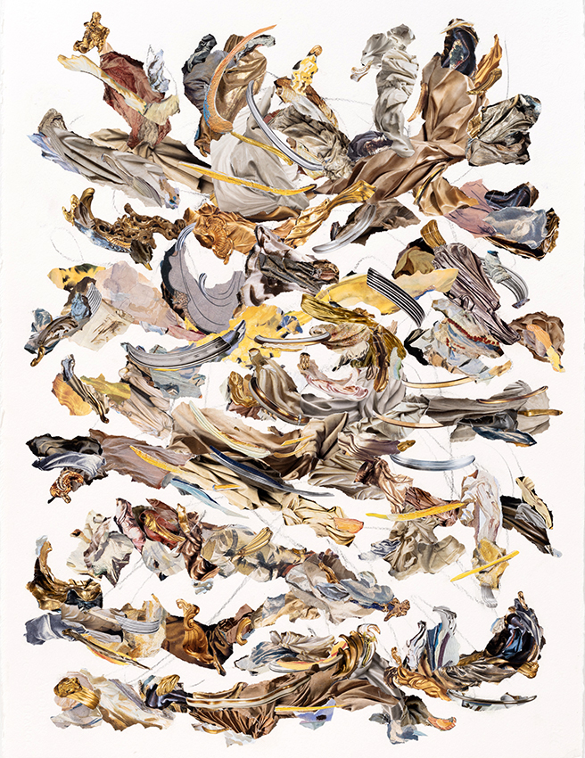 I have piles of these brushstrokes in my studio. I fashion them from auction catalogs filled with silver and gold objects, porcelain, and jewelry. I use reproductions of paintings and sculptures, and glean brushstrokes from Sargent’s watercolors or from works of the old masters. I cut, tear, paste, and inlay new strokes and form rearrangements of these elements, remaking them into something that is meaningful to me in the moment.