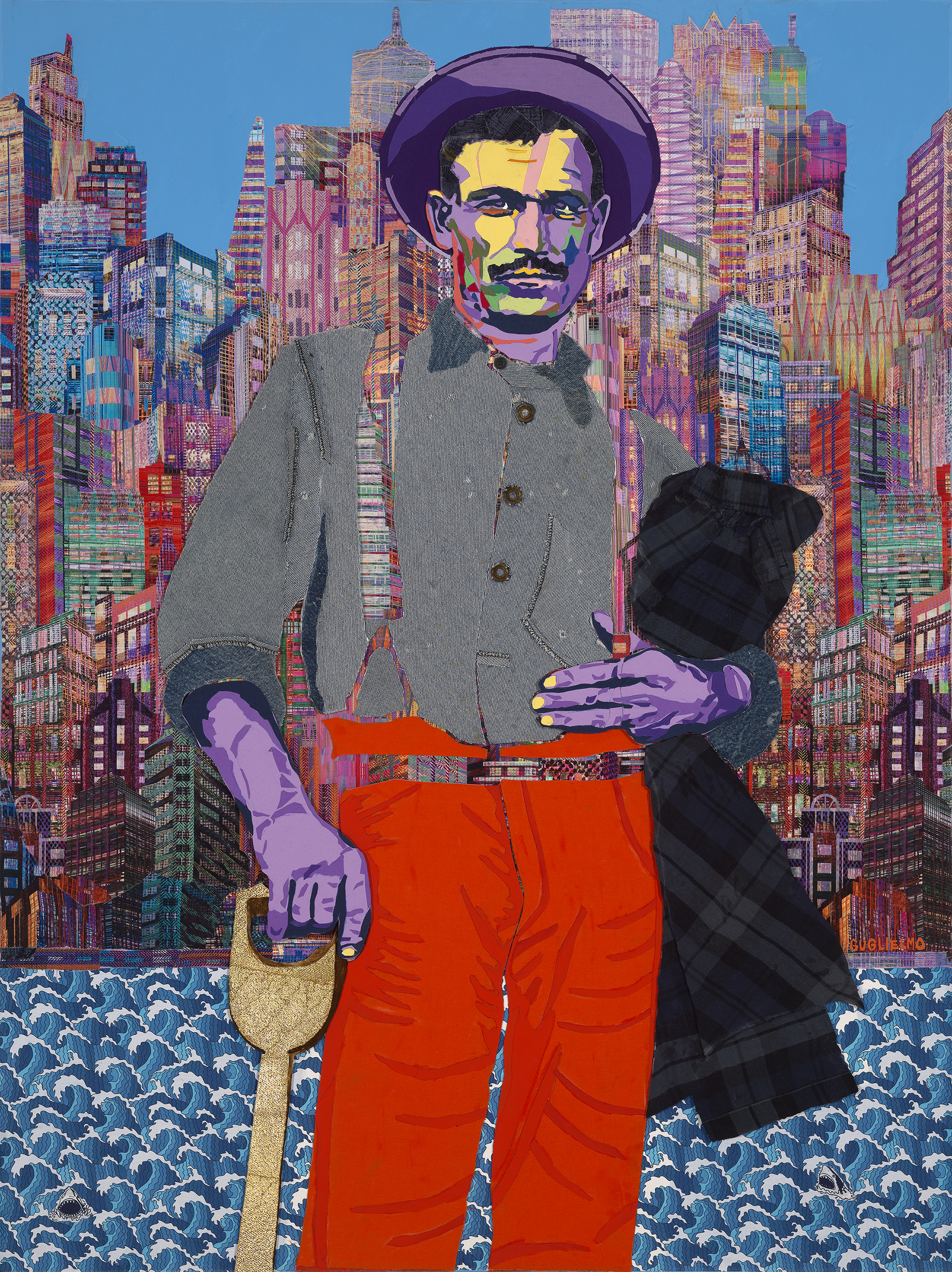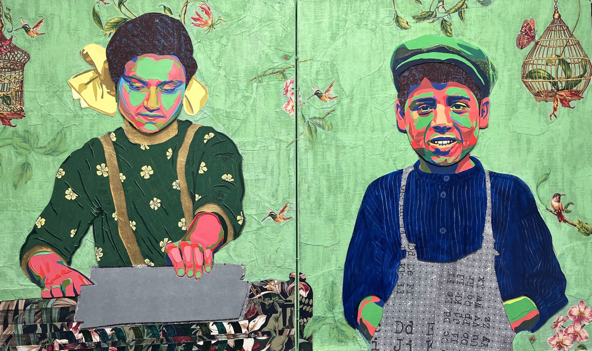 Through sight, sound, and story, I explore figurative work at the intersection of Western art, current events, and social history to examine issues of race, class, immigration, and power. Blending mixed media, I make life-size deconstructed portraits to peel back the layers and get to the core of the human condition. Audio and video recordings augment the sensory experience. Themes of memory, identity, and belonging permeate my oeuvre. Collage, with its infinite cut and paste options, is central to my practice and the bridge between my art and music. For years, I employed similar techniques producing hip-hop when I’d sample, truncate, and reconfigure existing sounds into new compositions.
