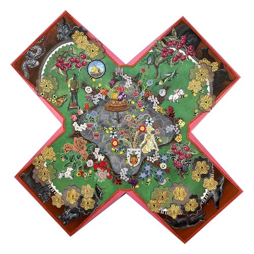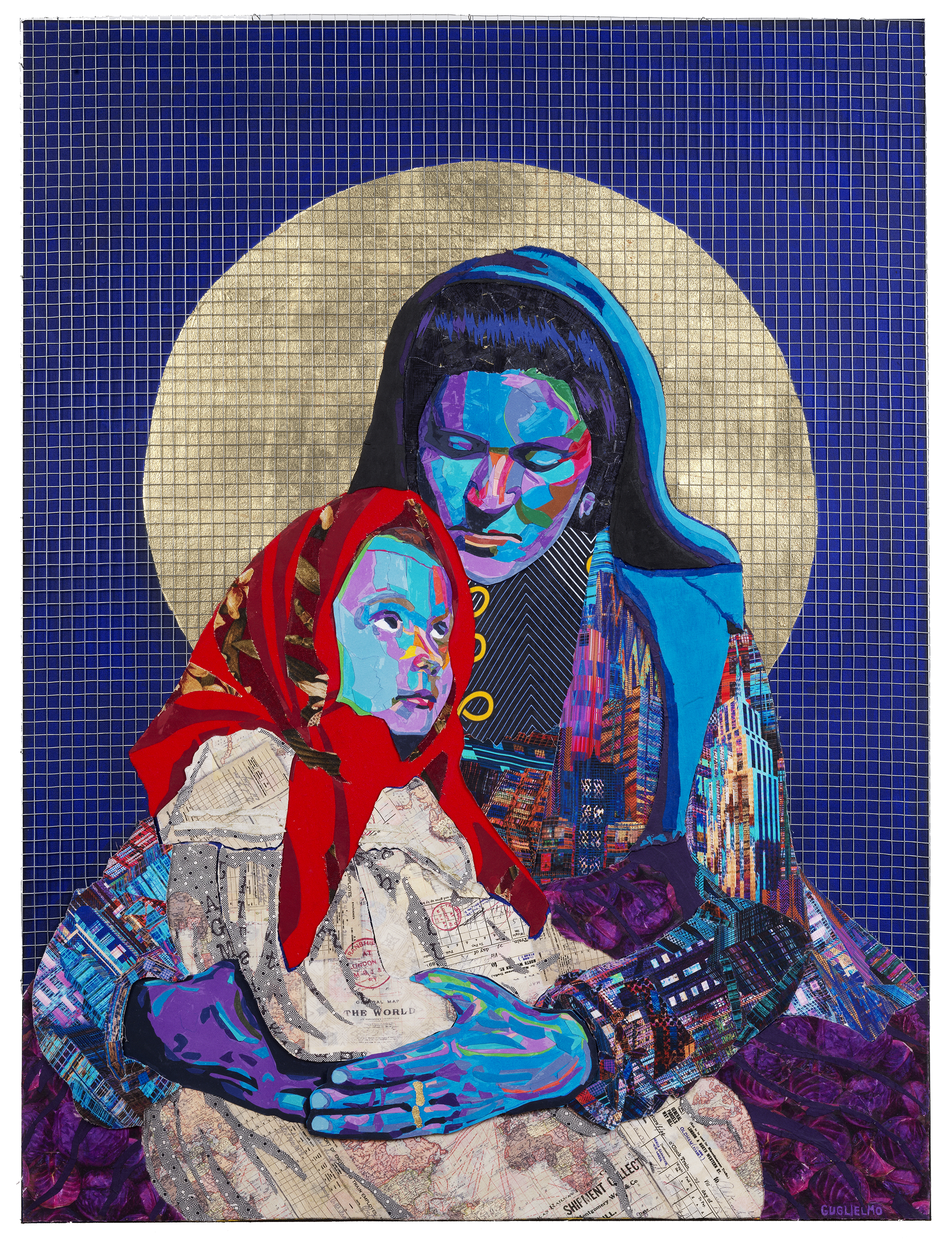 Expanding on my series in Cuba and Sicily, my current project examines the mounting costs Italian immigrants and their offspring have paid to access whiteness and “succeed” in America, drawing on James Baldwin’s piercing commentaries on race. Overlapping, fragmented surfaces mimic the shifting identities Southern Italians have embodied since arriving in the United States as expendable labor, from demonized dark-skinned “other” to violent defenders of whiteness, and everything in-between. Using bright, intense color, gold leaf, cut-up paper, rich fabric, oil, and acrylic paint, I excavate the essence of a disappearing culture, still virtually invisible in fine art, to map our transformation and reveal the underlying systems, factors, decisions, and events that led to its demise.