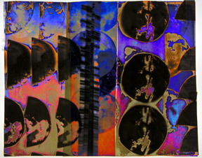 Animal X-rays, human X-rays, mammograms, and ultrasound radiographs as well as DNA sequencing gels and radiographs of cells growing in Petri dishes augment the artist’s materials that I use to create brightly colored digitalized giclee prints.