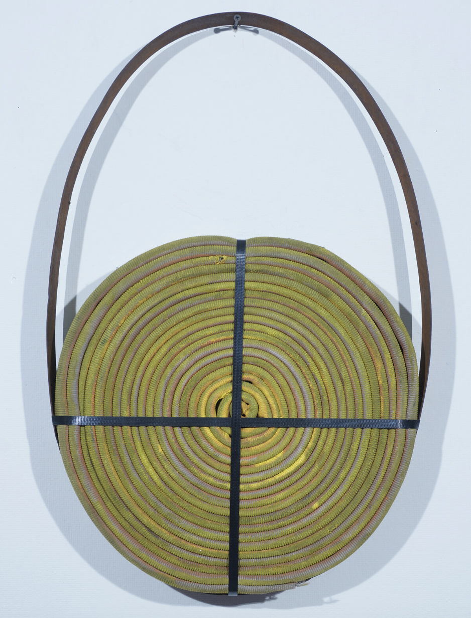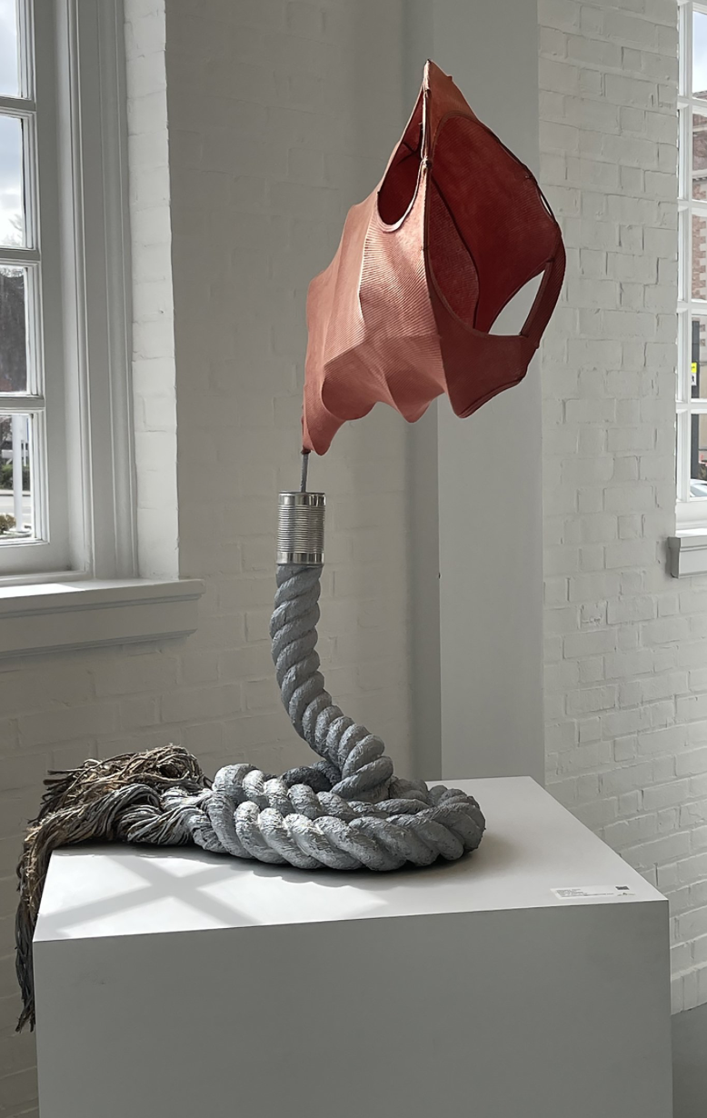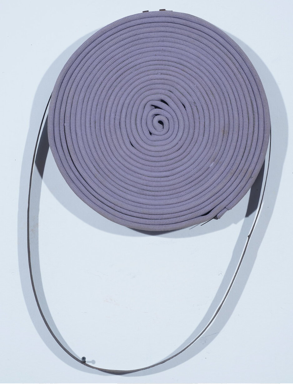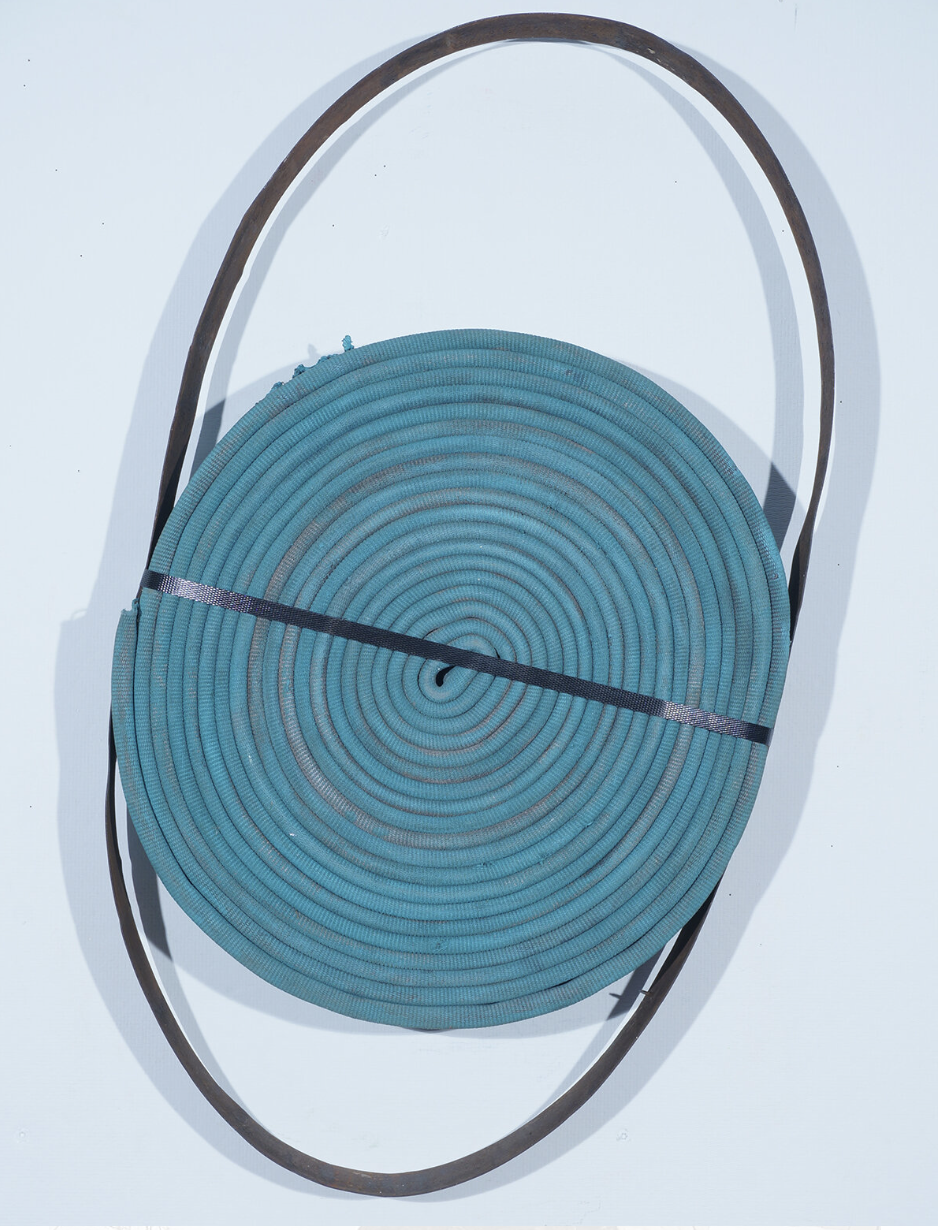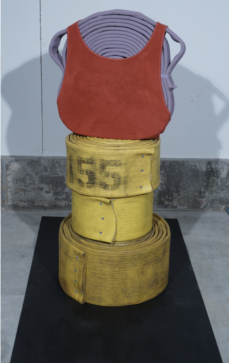 I’m using fire hose to create a parody of gyms. Personalized training creates strength but is often a replacement for and contributes to the perceived lack of value in manual labor. Making art needs manual labor. Using firehose and hand-dyed underwear suggests a human connection to my oddly scaled sculptures. Additionally, my wall assemblages including fire hose are formal contemplations.