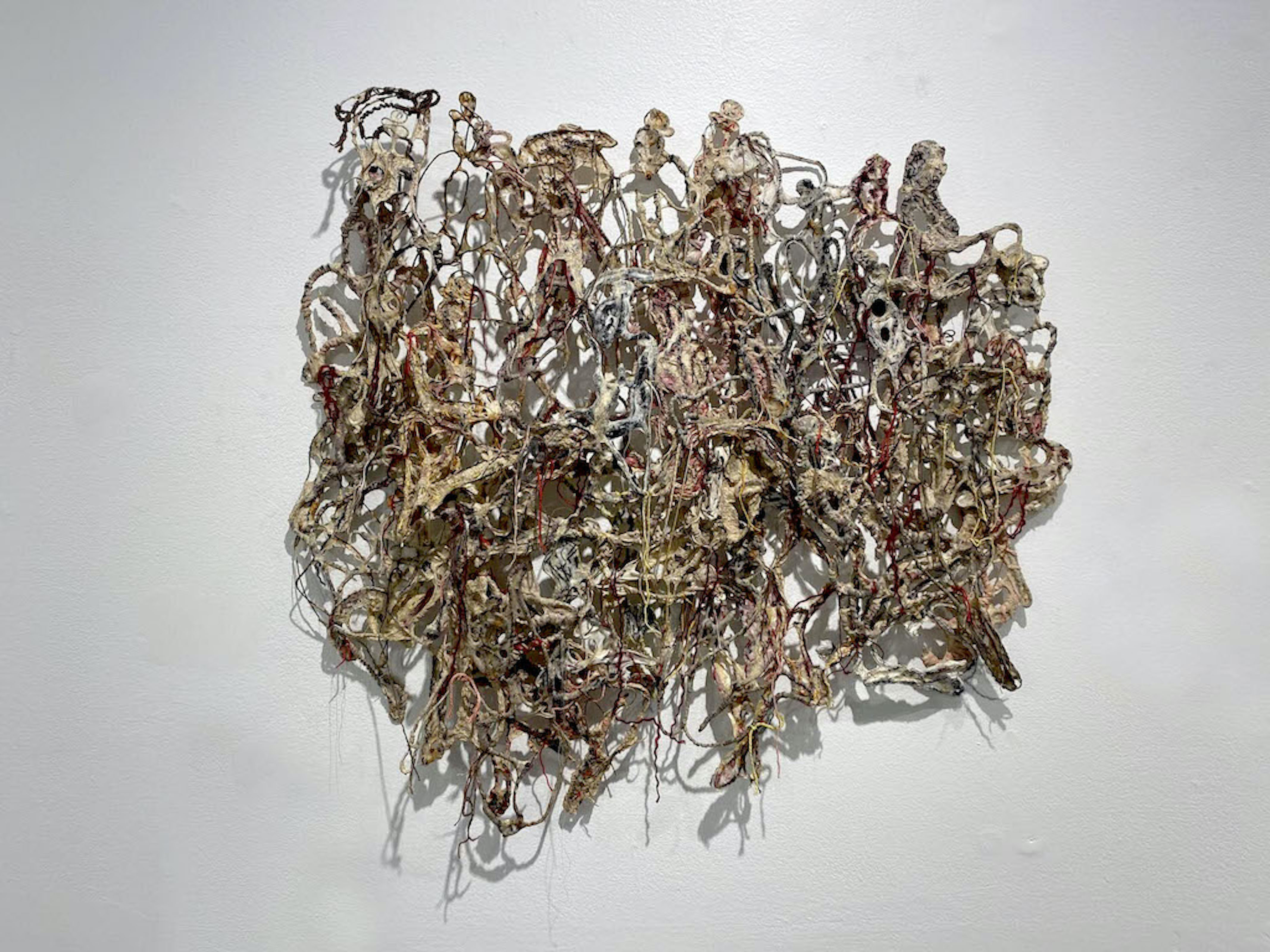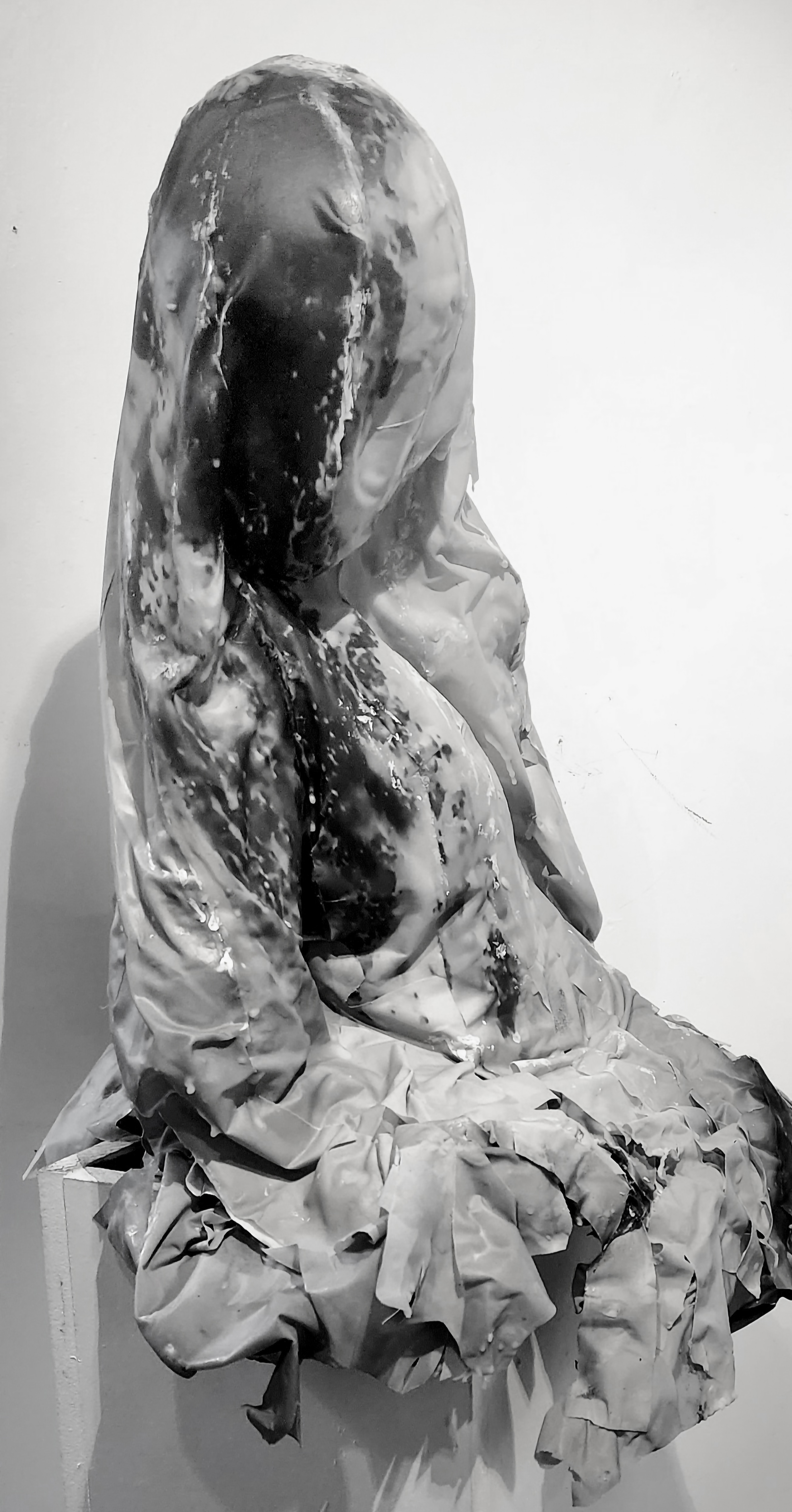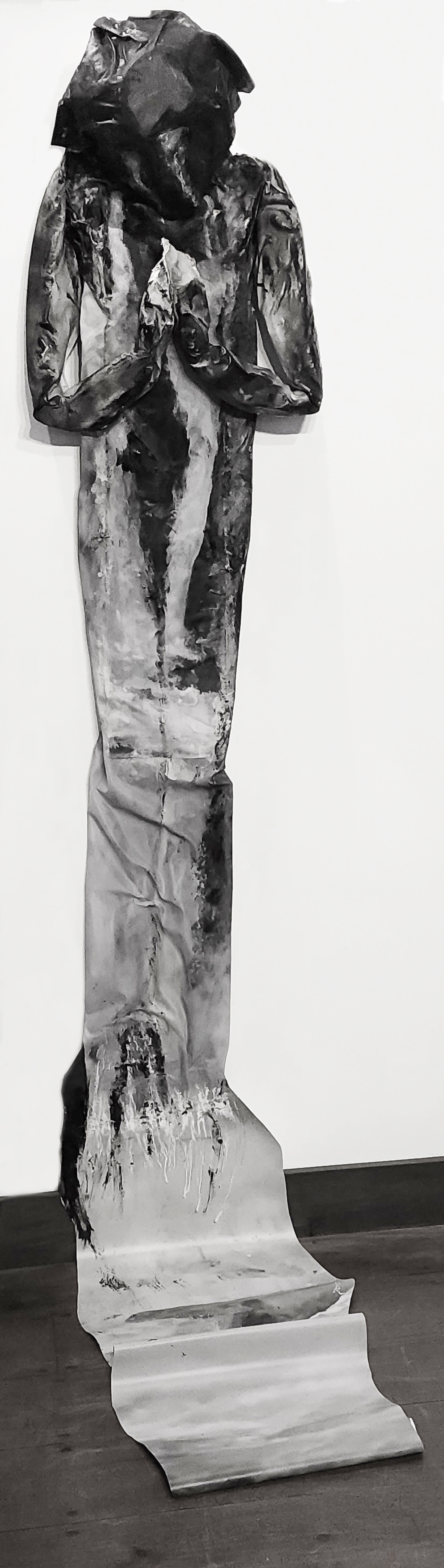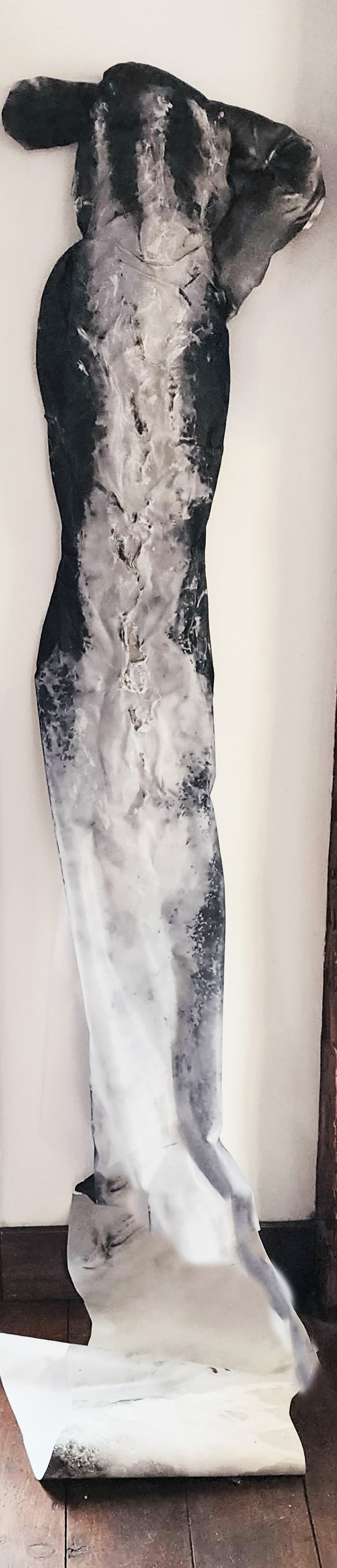 My process is as layered as my concept. Using my archival digital photographs, encaustic paints, sometimes on molded fabric, my images are of humanity and nature as one. They become relief sculptures, hanging scrolls, or life sized fully three-dimensional figures. All the images are encased in wax; forever preserved or mummified. The wax sometimes explodes to echo the power of nature or can fade the image itself into a face or a bodily form. They unveil the power of nature and humble us, as we bow to our own fragility. It all seeks to visualize and remind us that we are our environment.”
