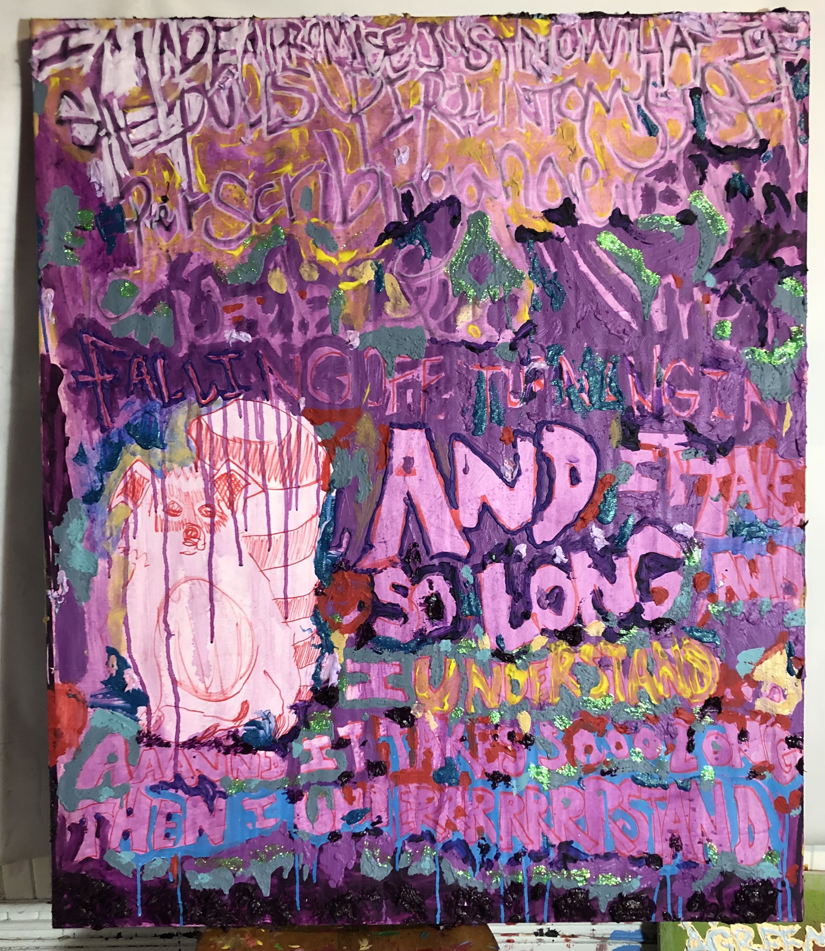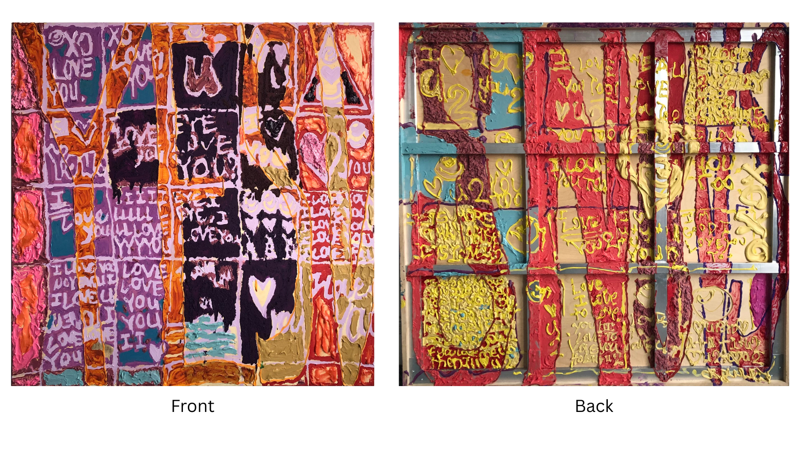 My art is about my life. I try to be as busy as possible and work as quickly as I can without judging what happens on the canvas or in a sculpture until it’s done. Even then, I enjoy the chance occurrences that exist in that chaos and want to share them with you. When someone looks at my work, I hope they experience it first and don’t read into what is written as an explanation of what is supposed to happen. Anything happens.