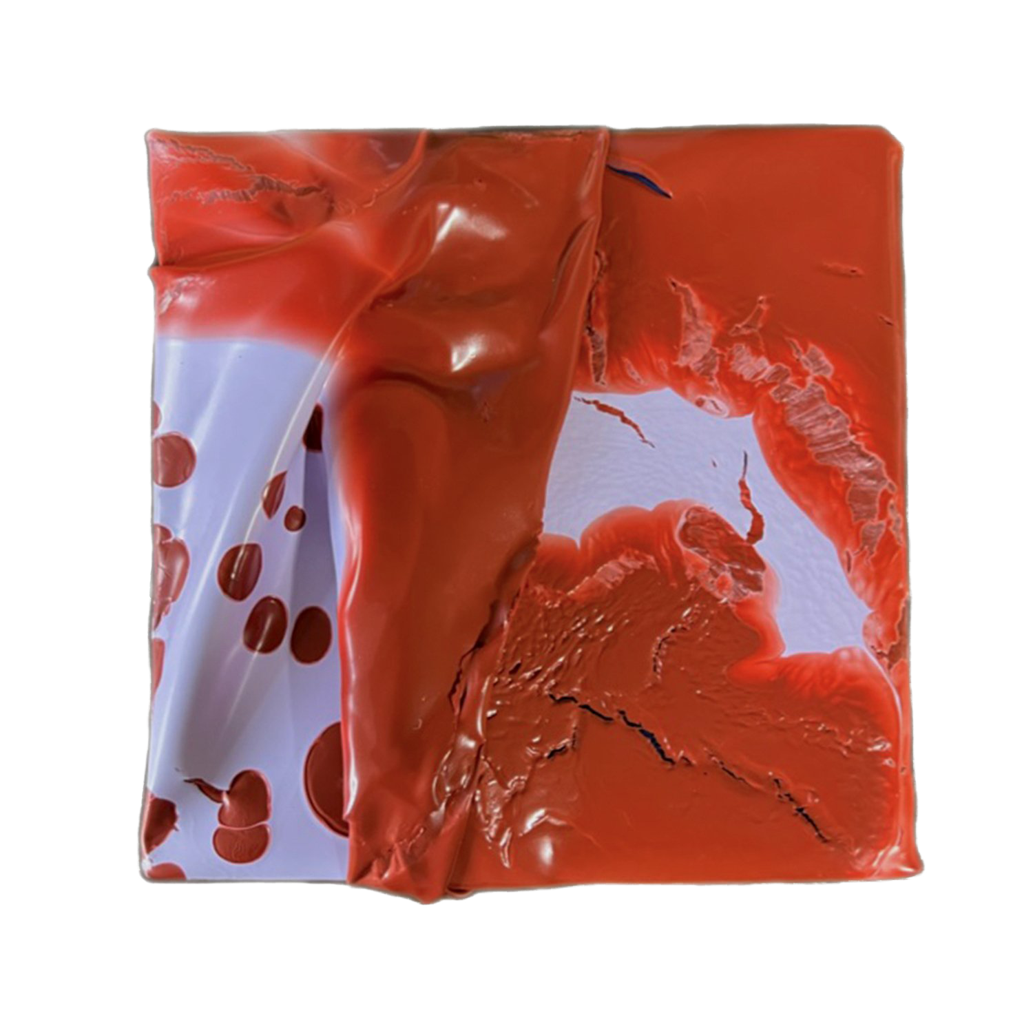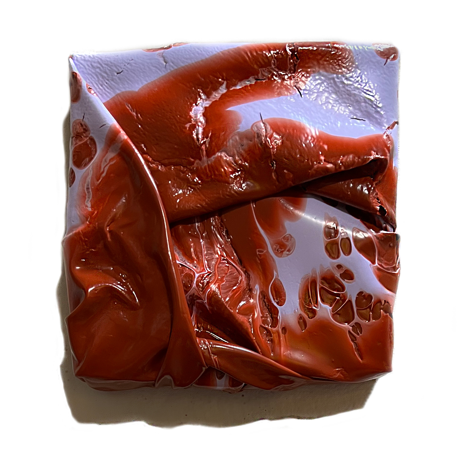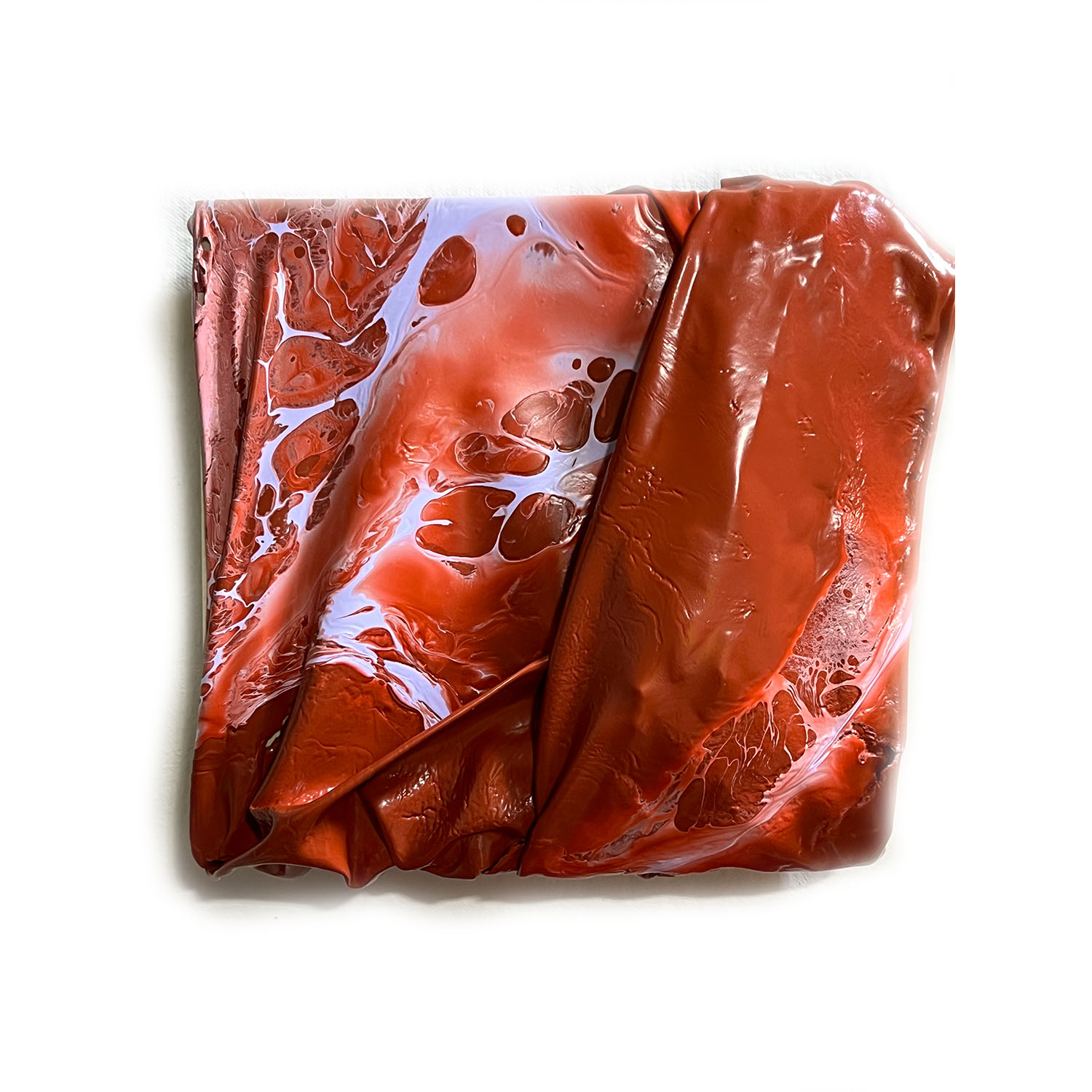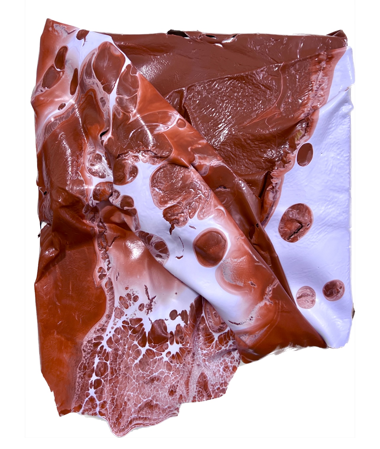 Flesh is a subseries of my work that is solely made of paint skins. My process includes layering, folding, and draping acrylic and latex paint skins as a way of connecting the raw physicality of my materials with the fleshiness of the body. The shapes and patterns swell and fold, and I’m fascinated by the way paint can be manipulated in unexpected ways, but not fully controlled. There is an element of surprise when creating these by mixing different viscosities of old house paint. I was immediately intrigued by how the two colors reacted to one another, becoming marbled, resembling meat or musculature. With connections to the exploration and representation of the human body throughout my work, these sculptural paintings delve deeper into abstracted anatomy.