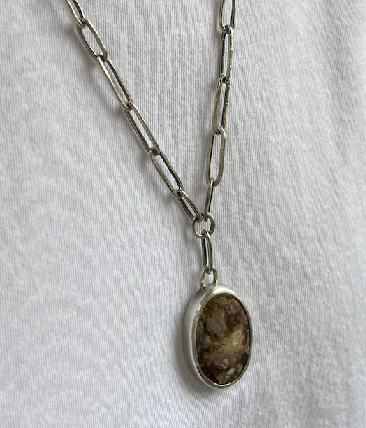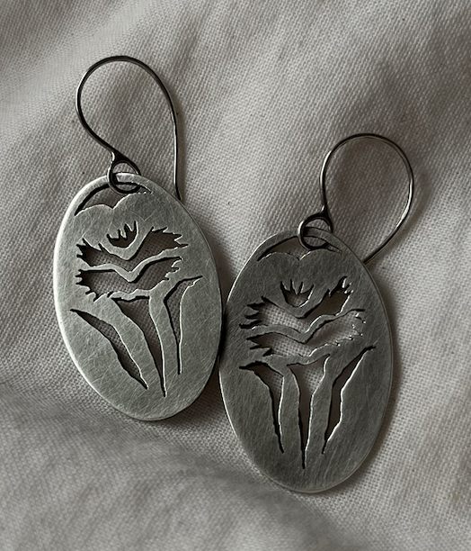 Working in sterling silver, I forge individual chain links by hand and saw floral motifs with improvised precision. My practice is shaped by process, with unpredictability serving as a source of creative momentum. This process is slow, deliberate, and often scattered, marked by pauses and trials. A single piece may take months, not due to complexity alone, but because I let intuition and time guide me more than rigid planning. Close inspection of my work reveals marks left by my hammer and saw frame — subtle scratches and imperfections that I embrace as evidence of the hand at work. I view these unintentional remnants not so much as flaws, but as traces of the labor and presence behind the piece. There is a quiet honesty in them, an essence of rough beauty. At times, I incorporate an intimate gesture in my work: a secret detail resting close to the skin, hidden from public view. My work is created to be worn, not confined; its true life begins on the body. My jewelry carries both delicacy and grit, fragility and endurance — a reflection of the process I deeply value.