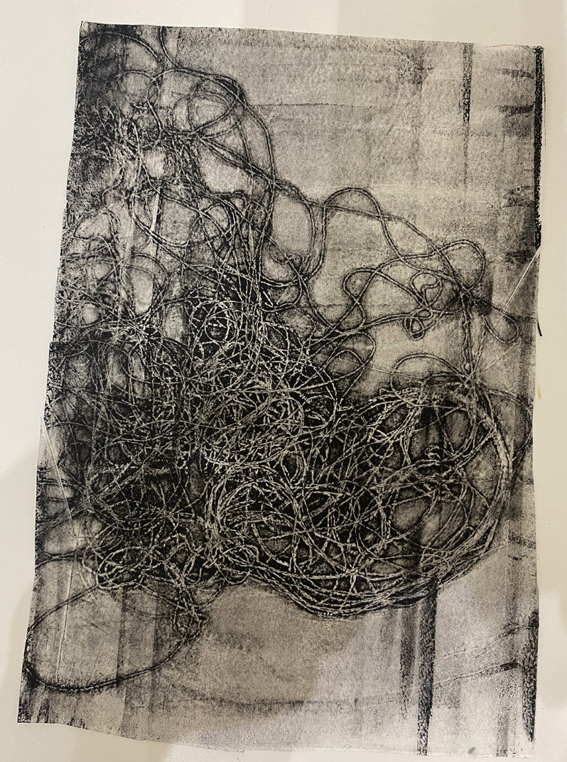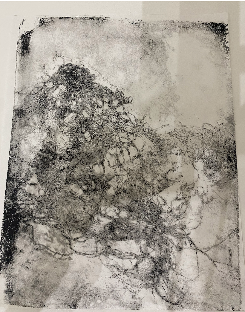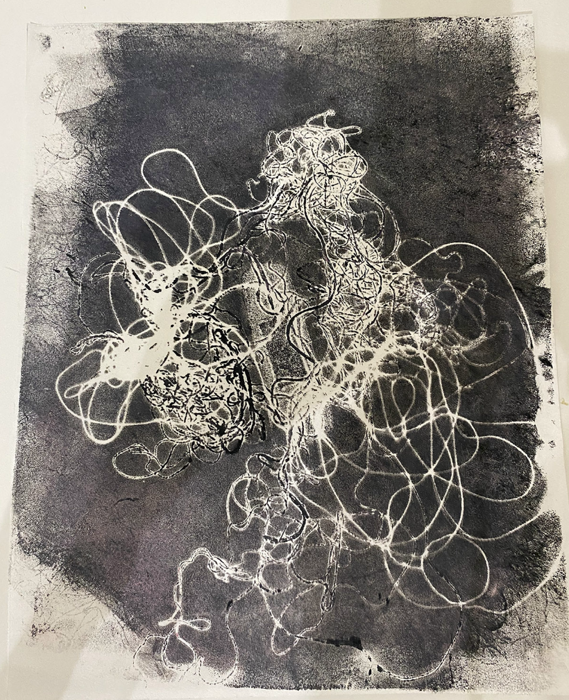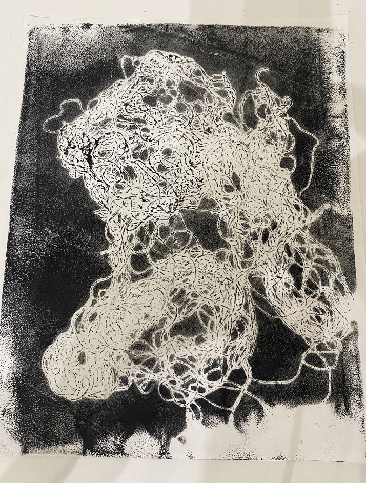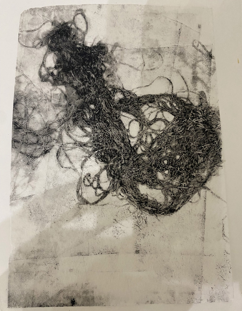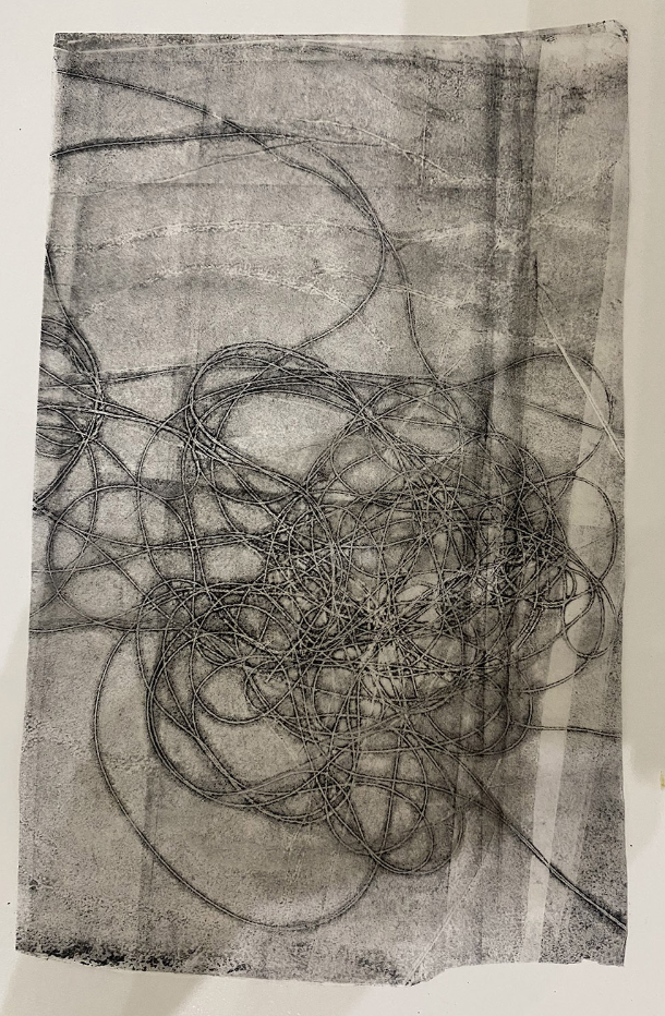 In my current series, “Steps to a seismic collapse”, I make a series of gelatin prints of thread on a variety of different papers. Once the gelatin prints are finished, I edit through the pieces and begin to hang the individual pieces with straight pins and magnets on a wall to create an installation. This work is a homage to my mother that passed away and to the mother daughter relationship we shared together.
