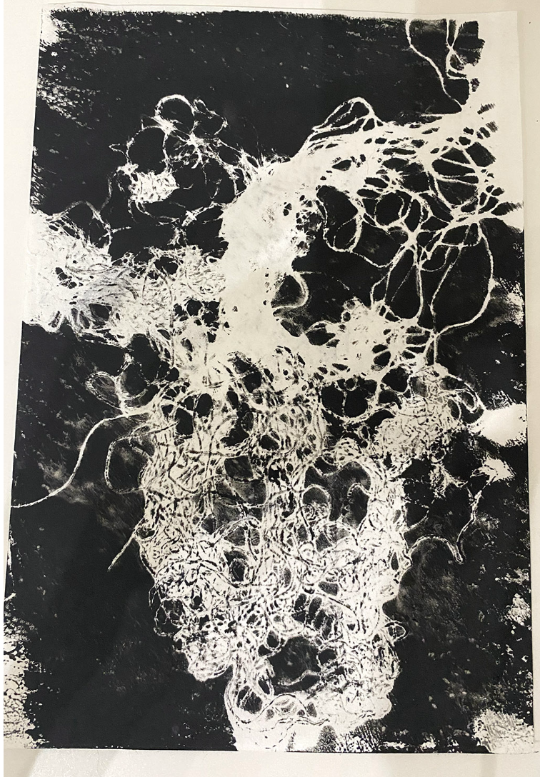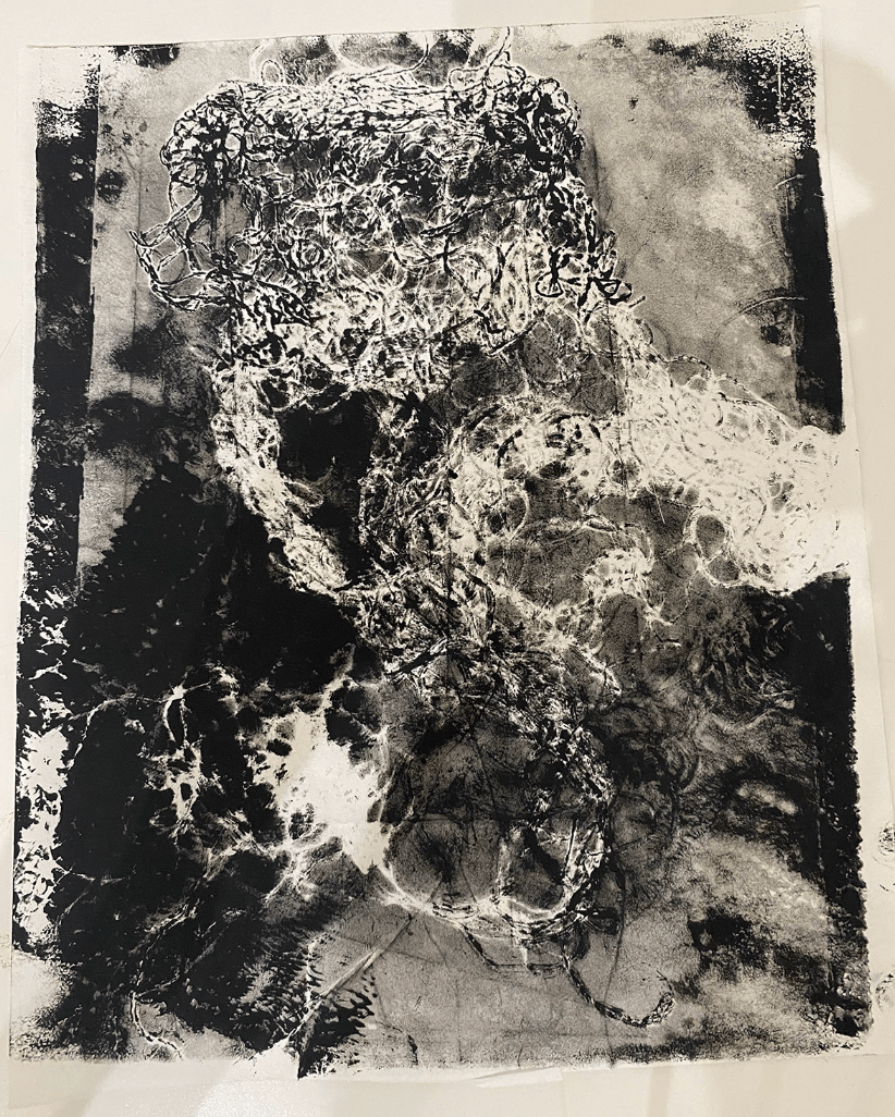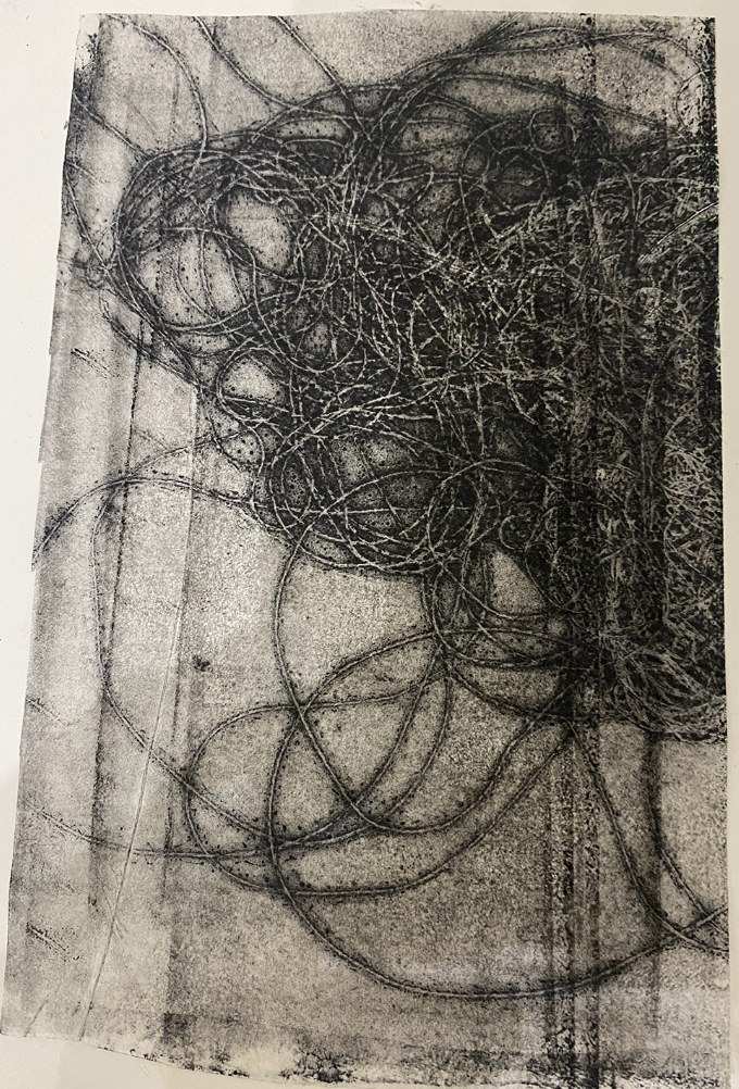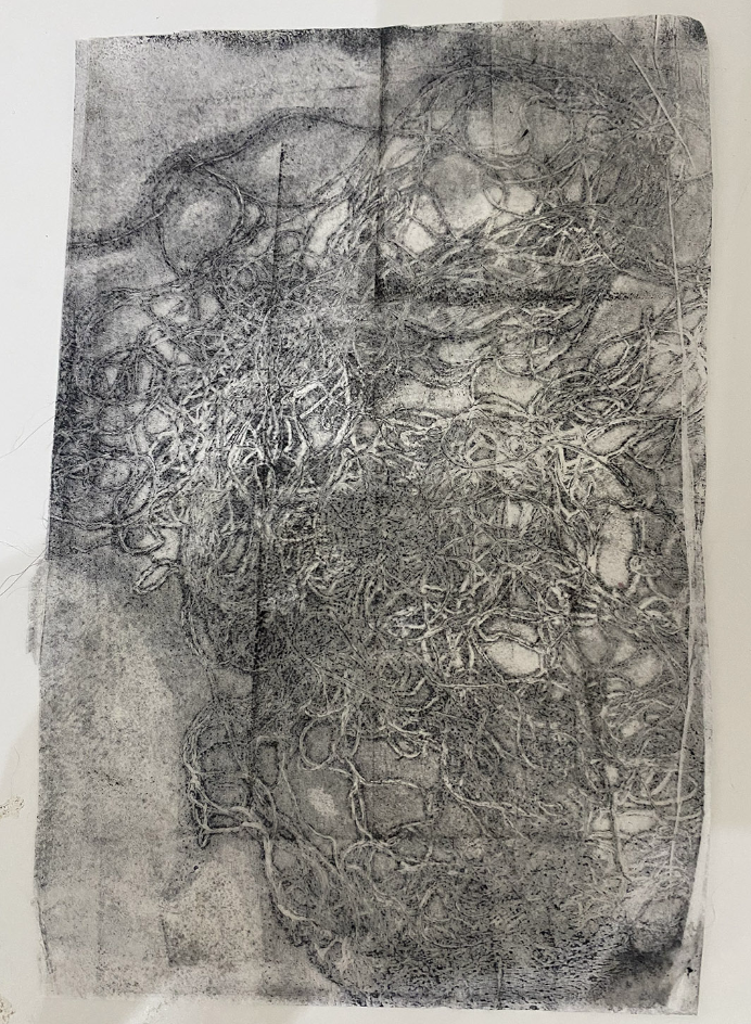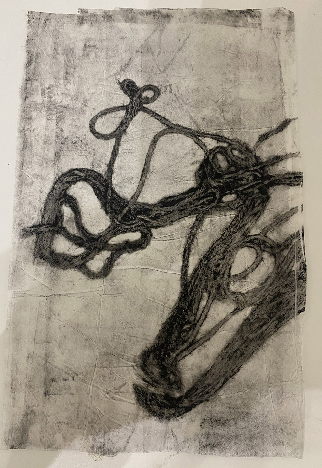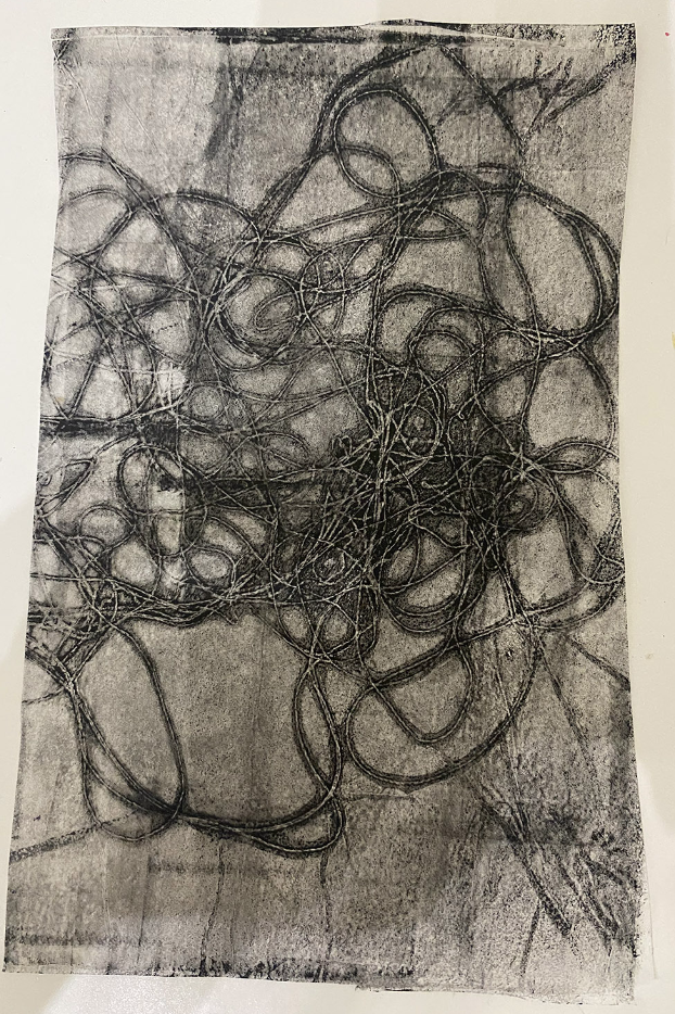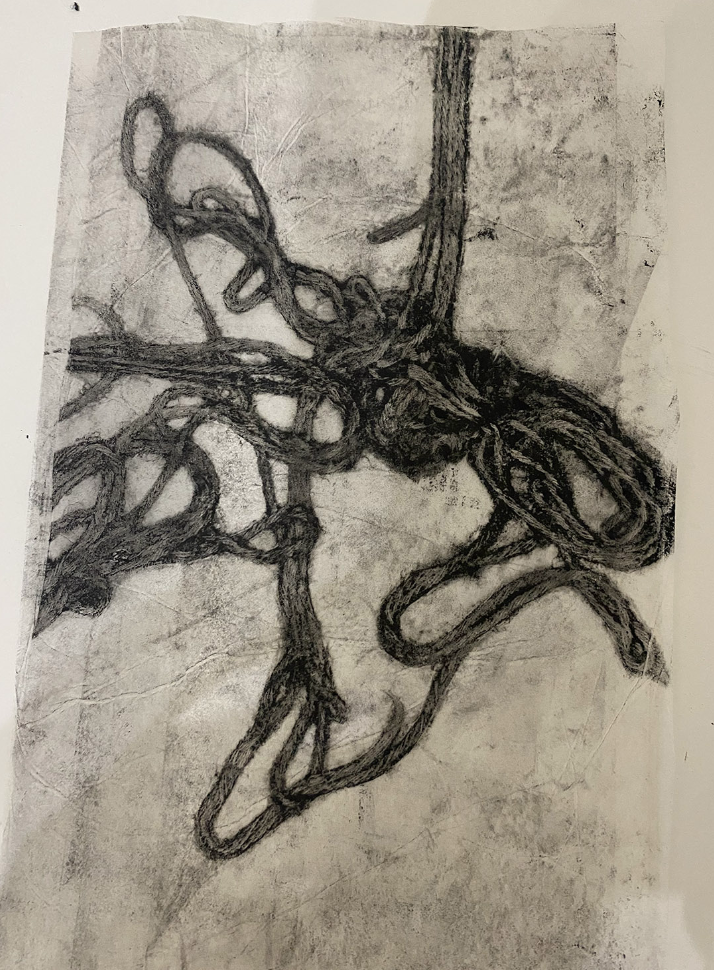 In my current series, “Steps to a seismic collapse”, I make a series of gelatin prints of thread on a variety of different papers. Once the gelatin prints are finished, I edit through the pieces and begin to hang the individual pieces with straight pins and magnets on a wall to create an installation. This work is a homage to my mother that passed away and to the mother daughter relationship we shared together.