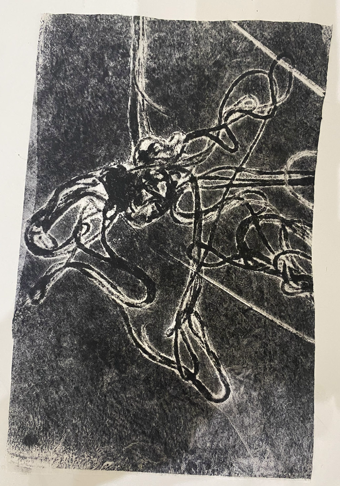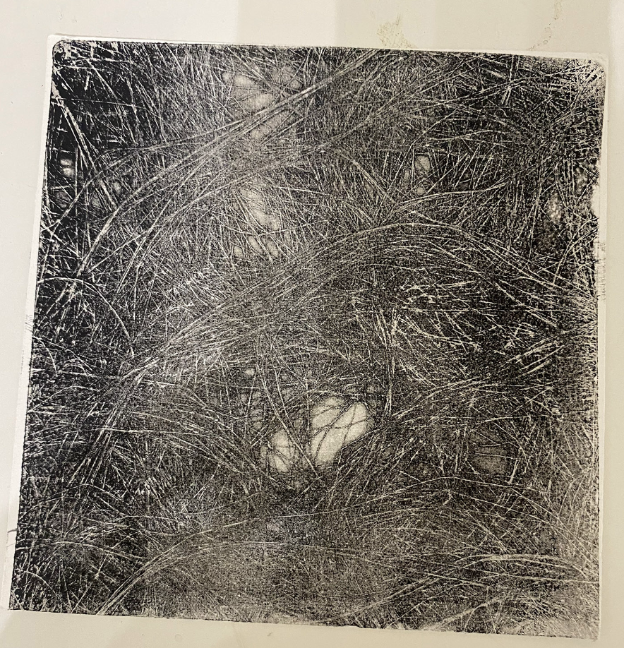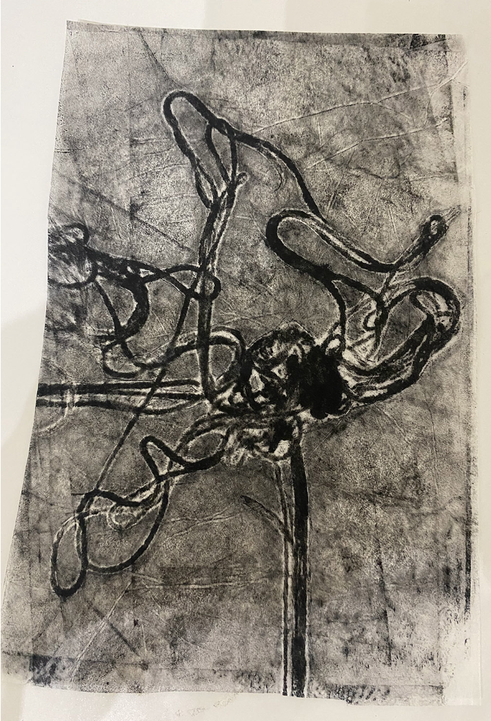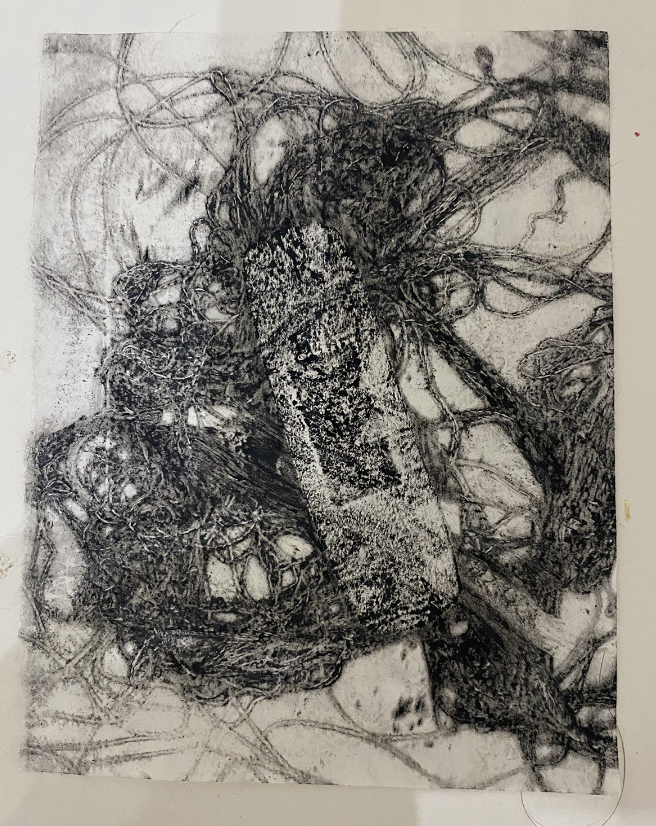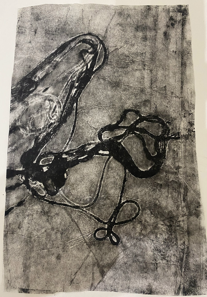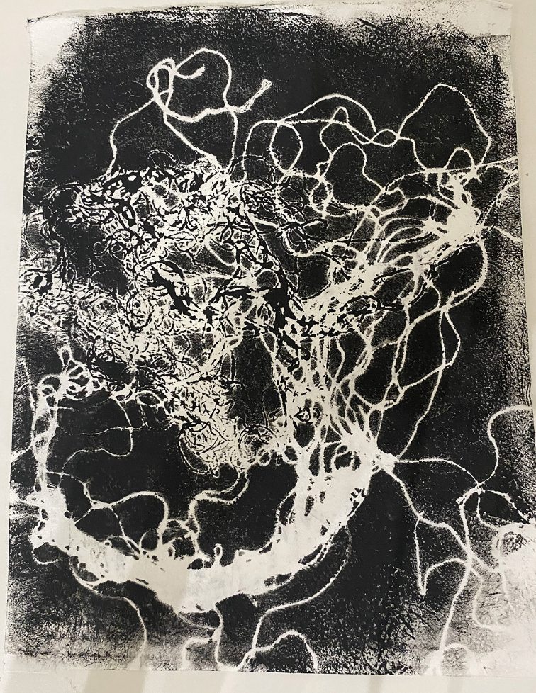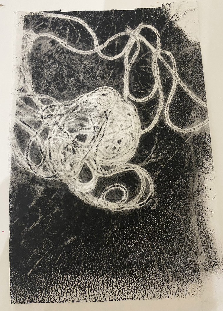 In my current series, “Steps to a seismic collapse”, I make a series of gelatin prints of thread on a variety of different papers. Once the gelatin prints are finished, I edit through the pieces and begin to hang the individual pieces with straight pins and magnets on a wall to create an installation. This work is a homage to my mother that passed away and to the mother daughter relationship we shared together.