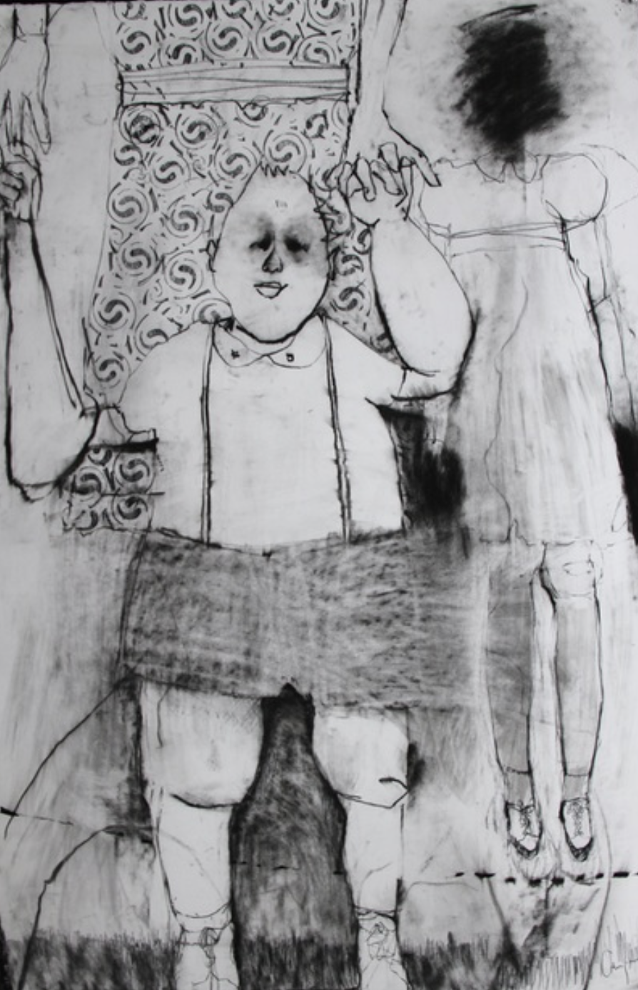 For this drawing series I started with a vintage family photo of four siblings posing together on Easter Sunday of 1943 as a subject and point of departure. To start I based the general composition on these four children and then working in charcoal by layering, mark-making, and erasure I altered their appearances into something other than simple happy family members.