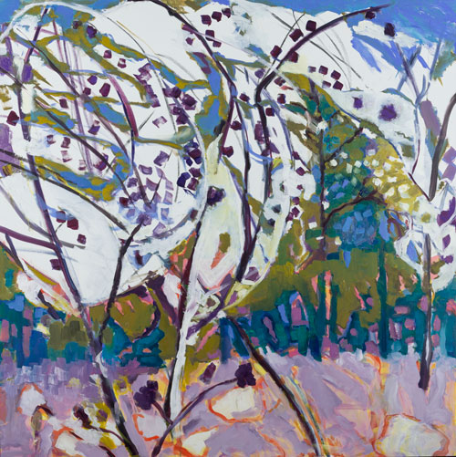 This exhibition features large oil paintings and several smaller works, all on cradled birch panels. The prepared surface plays a large part in my process. I stain and paint areas of the panels while selectively exposing the white of the prepared board. Lyrical and vigorous brush strokes offer a counterpoint to my geometric shapes. I use the whiteness of the panel as part of my palette which requires some forethought in the process. At the same time, I stain areas with vibrant color and allow each layer and stroke to be visible. This layering requires me to work on several images at once with a sense of immediacy in each stroke and layer. “Sometimes it means wiping out a day’s work to preserve a sense of immediacy in the painting. Other times, I leave the history to create visual depth.”
