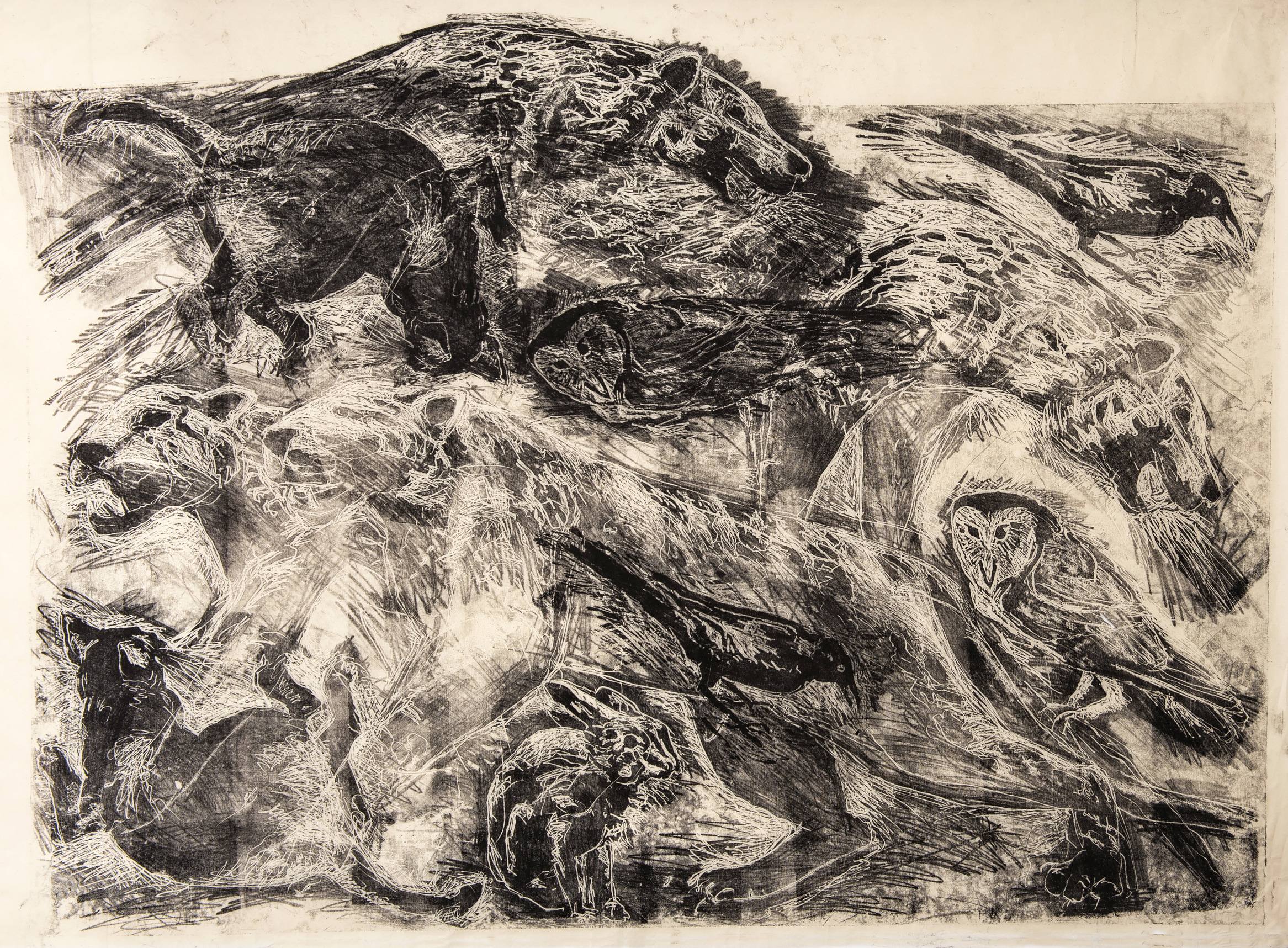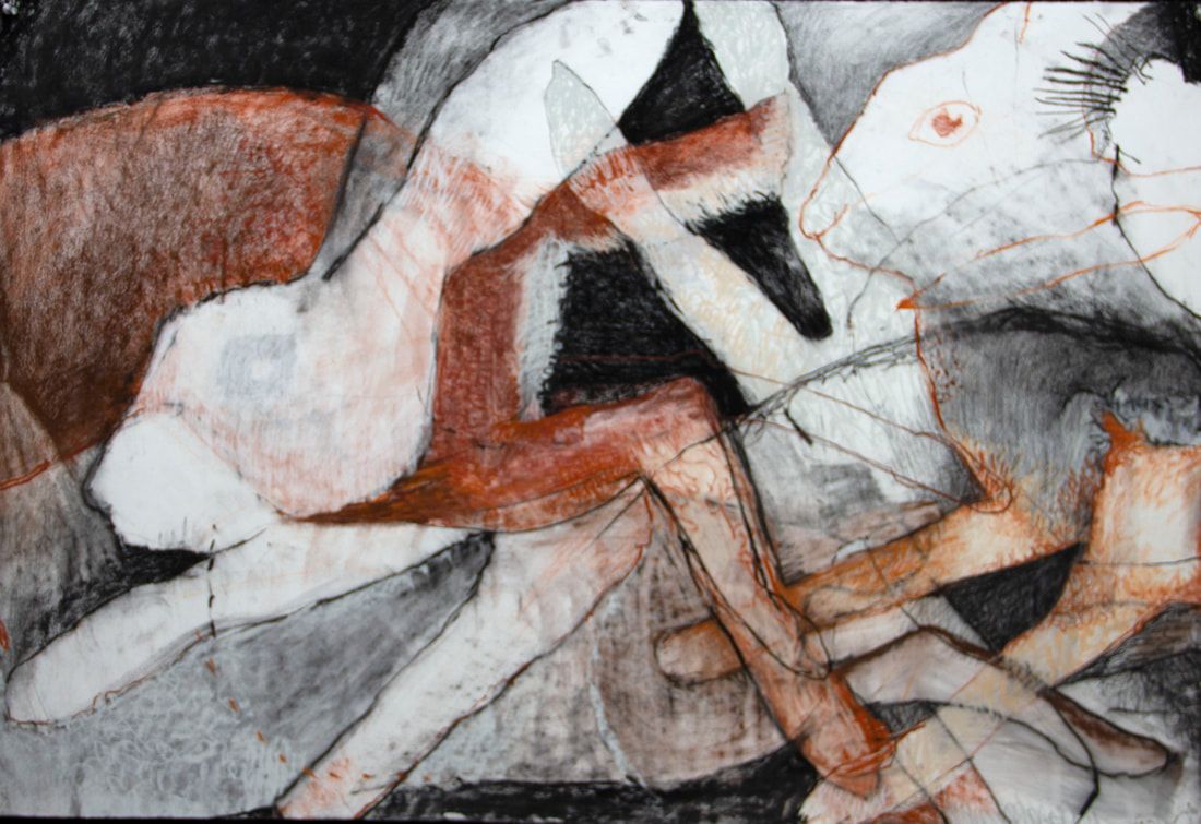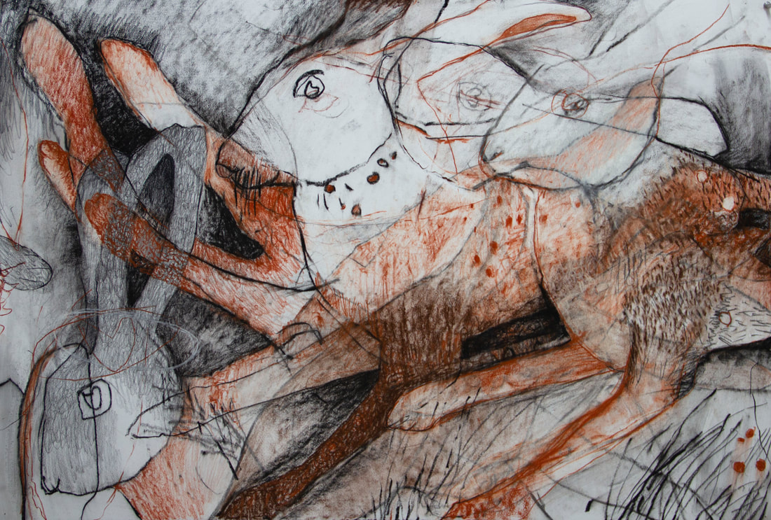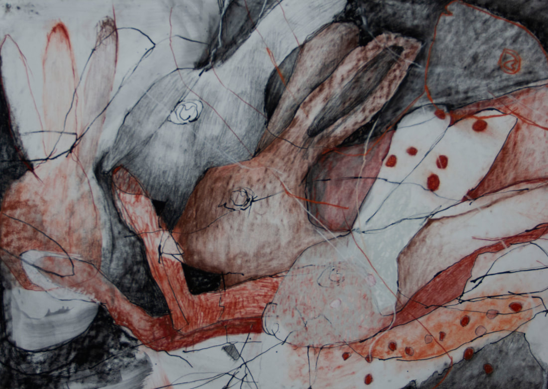The title of this drawing comes from the Irish saying “To Start a Hare Running” which means when an action you take triggers an onward problem, usually unforeseen and out of your control. The concept of an animal standing in for humans causing trouble interested me and I worked across these four panels with layering and erasure building chaos and confusion.
