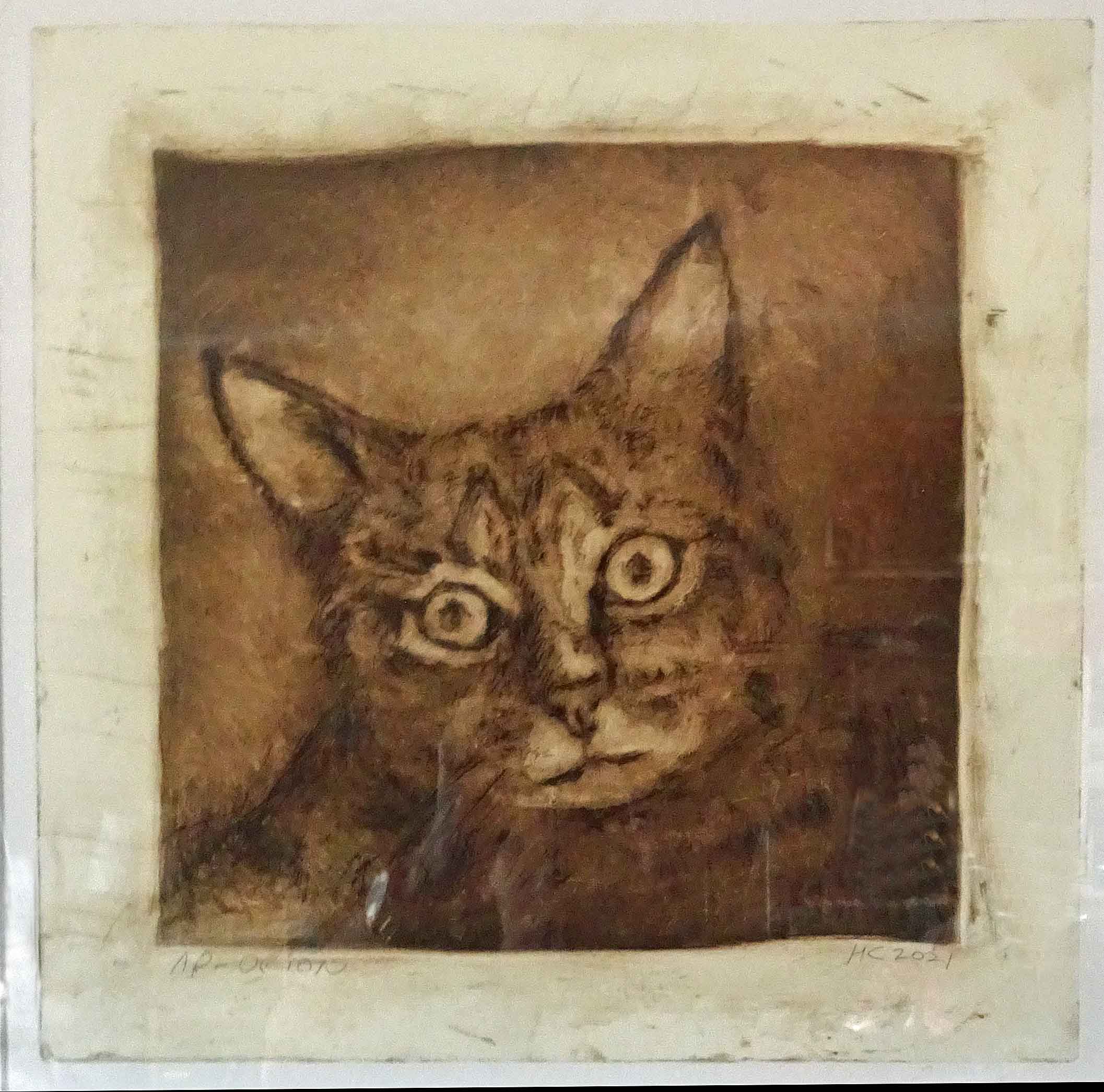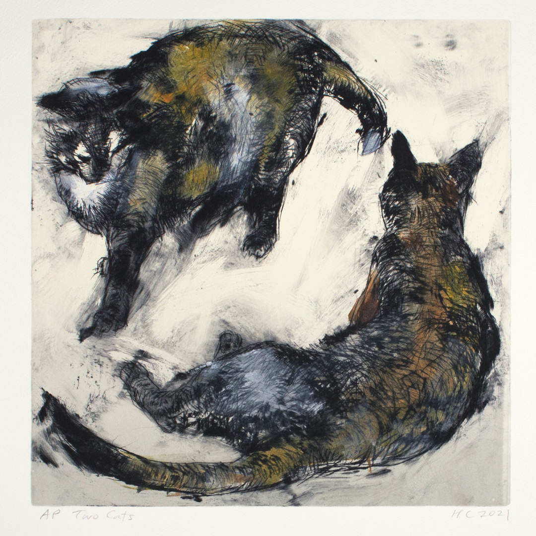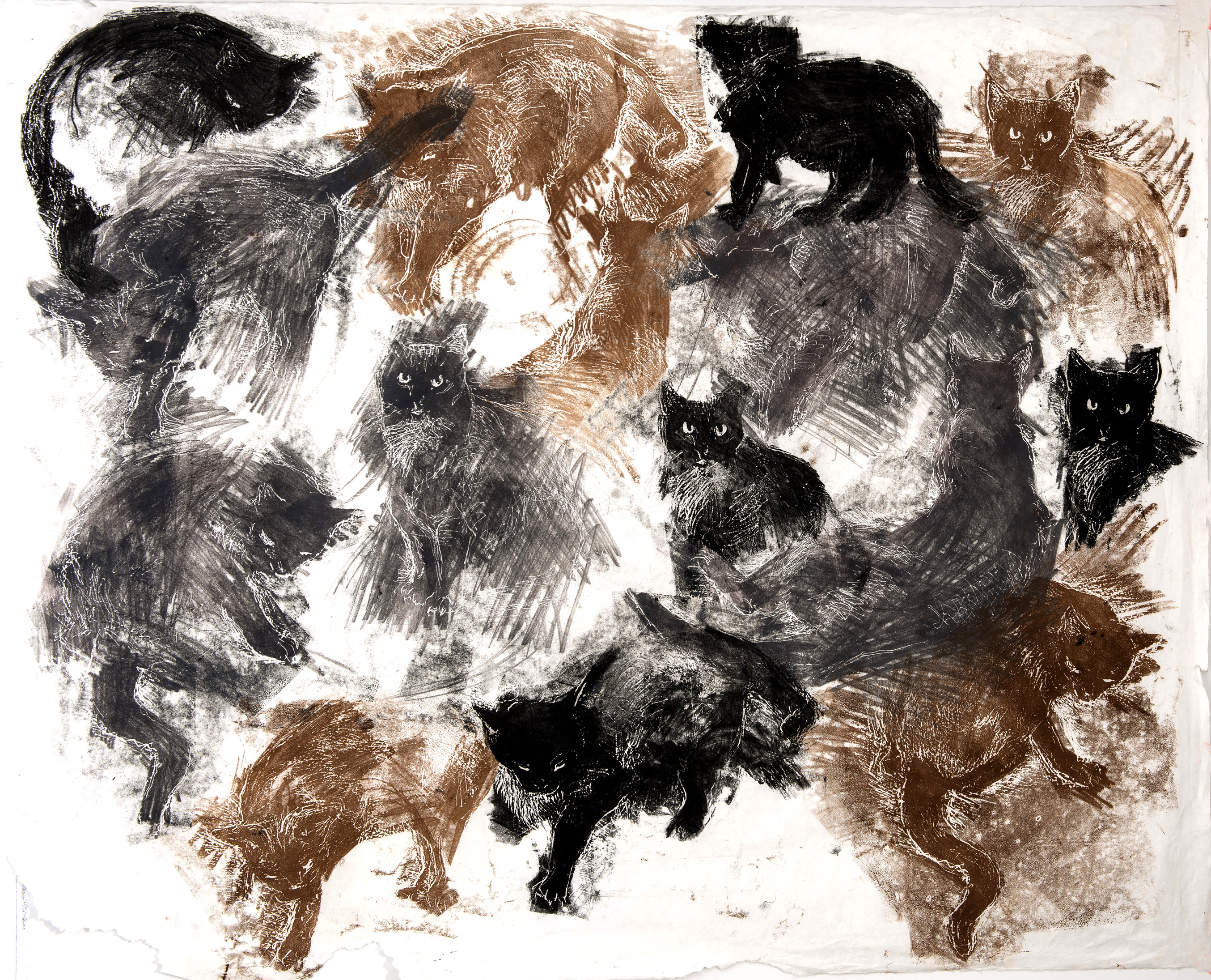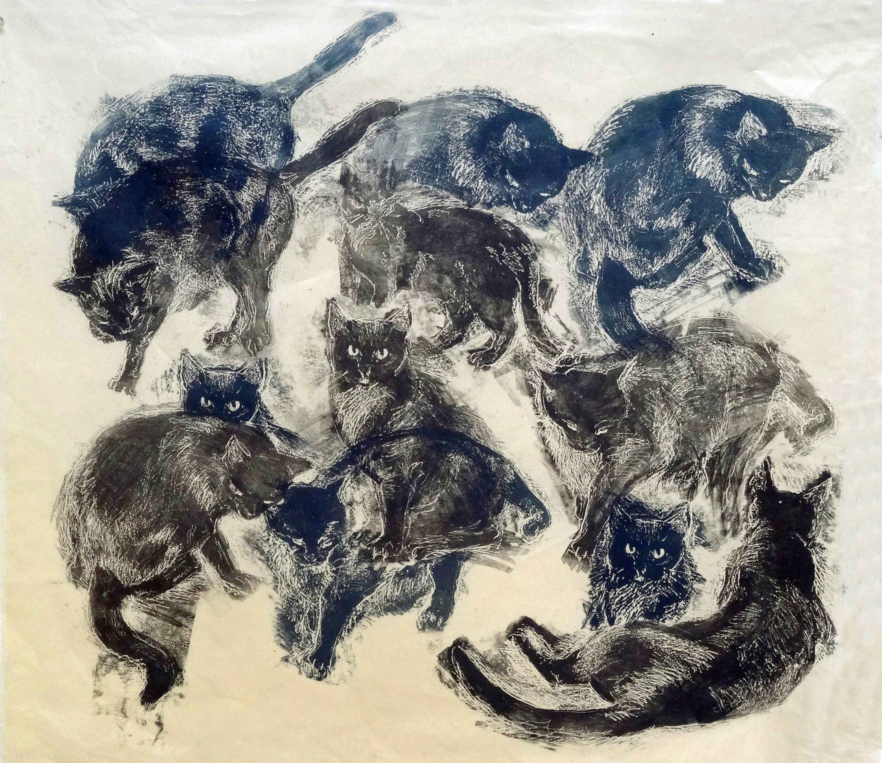 When I was young, and somewhat quiet and secretive, I preferred animals to people. They seemed to be that way too, and were more beautiful. I mostly still feel that way (some exceptions: black widows, electric eels). We had cats and dogs growing up in the country, and I have cats today, the subject of most of these prints. When my Orion the First and The Princess Fang died, I made the woodcuts that are “Very Superstitious” and “Cave Cats,” which is also an homage to the prehistoric cave paintings of Lascaux and others in France, which I have visited many times. The etchings “Yellow Eyes” and “Orion the Second” were done at the Lyme Academy of Fine Arts, where I just completed five years as monitor for the print studio. The large woodcut “La Chasse” (The Hunt) is the result of a visit to a museum in Paris devoted to “Nature and the Hunt,” a monstrous collection of slaughtered and stuffed animals. I photographed many, which I used to make drawings on plywood boards, then carved and hand printed in repetitive patterns of outrage and flight.