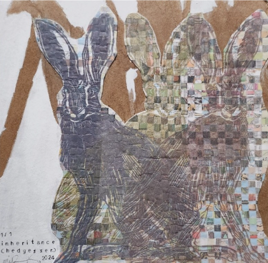 Over these handwoven sheets, Mike prints his line drawings, arriving at multi-layered relief or intaglio prints. The interwoven grid of paper along with its color and text fragments are as visible inside the lines of a drawing as they are around it. You might see a drawn skateboard rider or a dress from another era emphasized in one image while a fox, rabbit or owl occupies another. But in each print, figure and ground remain always intertwined with the material and previous content of the paper.