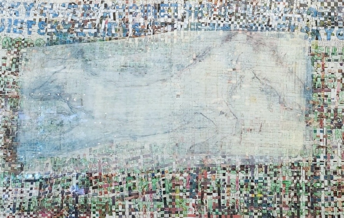 In his prints on handwoven paper, Mike Sweeney renders distinctions between figure and ground (or maybe subject and setting) difficult to define. Mike is a printmaker and paper artist who relies on simple line drawings laid over woven strips of his own paper. He draws what he sees around him in everyday life. His drawings are nearly always simple and recognizable subjects that become complicated by misalignment and reprinting, as well as by the material they are printed on.