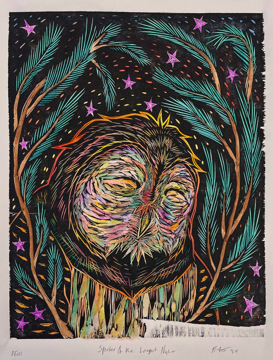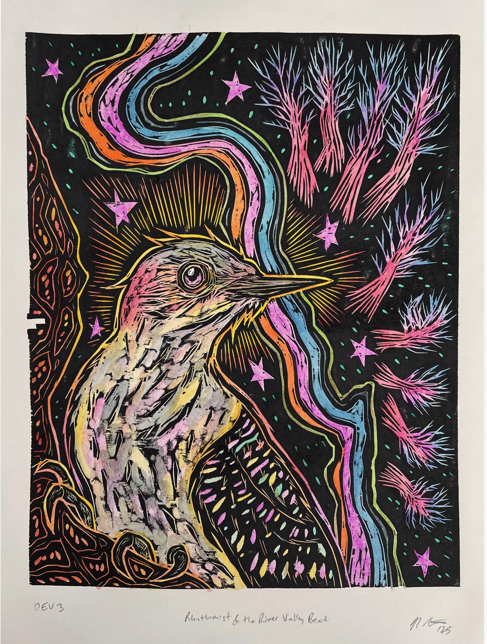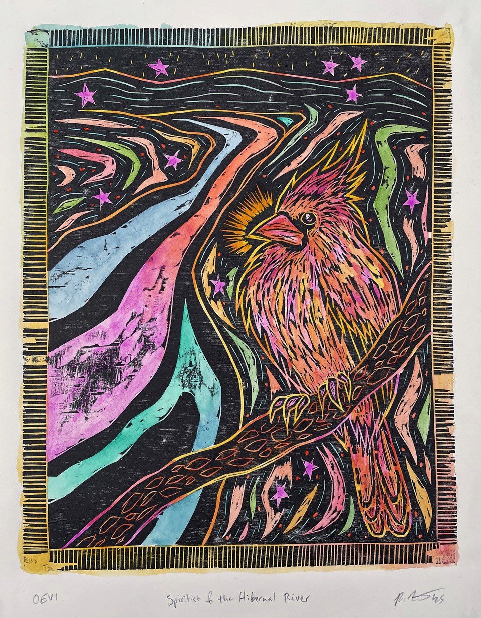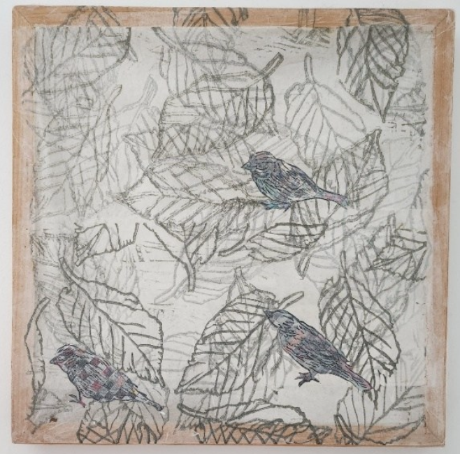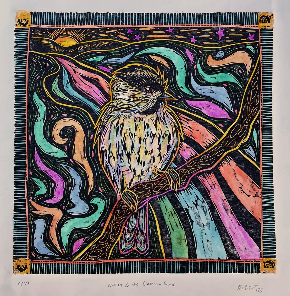 Through the labor of woodcut printmaking and hand-coloring, my current work is centered primarily around my relationship to birds. Stemming from an early childhood fixation with learning about and imitating birds, my woodcut images are built by way of expressive mark-making and color. Their titles often share my own “names” for specific birds, nodding to their traits and symbolism. This work advocates respect and admiration for nature and the environment.
