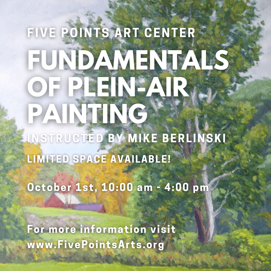 The Fundamentals of Plein-Air Painting Instructor Name: Mike Berlinski Date(s): October 1st Time(s): 10:00 – 4:00 Location: Five Points Art Center Landscape Ages: 18+ Cost: $90 Class Cap: 10 Workshop […]